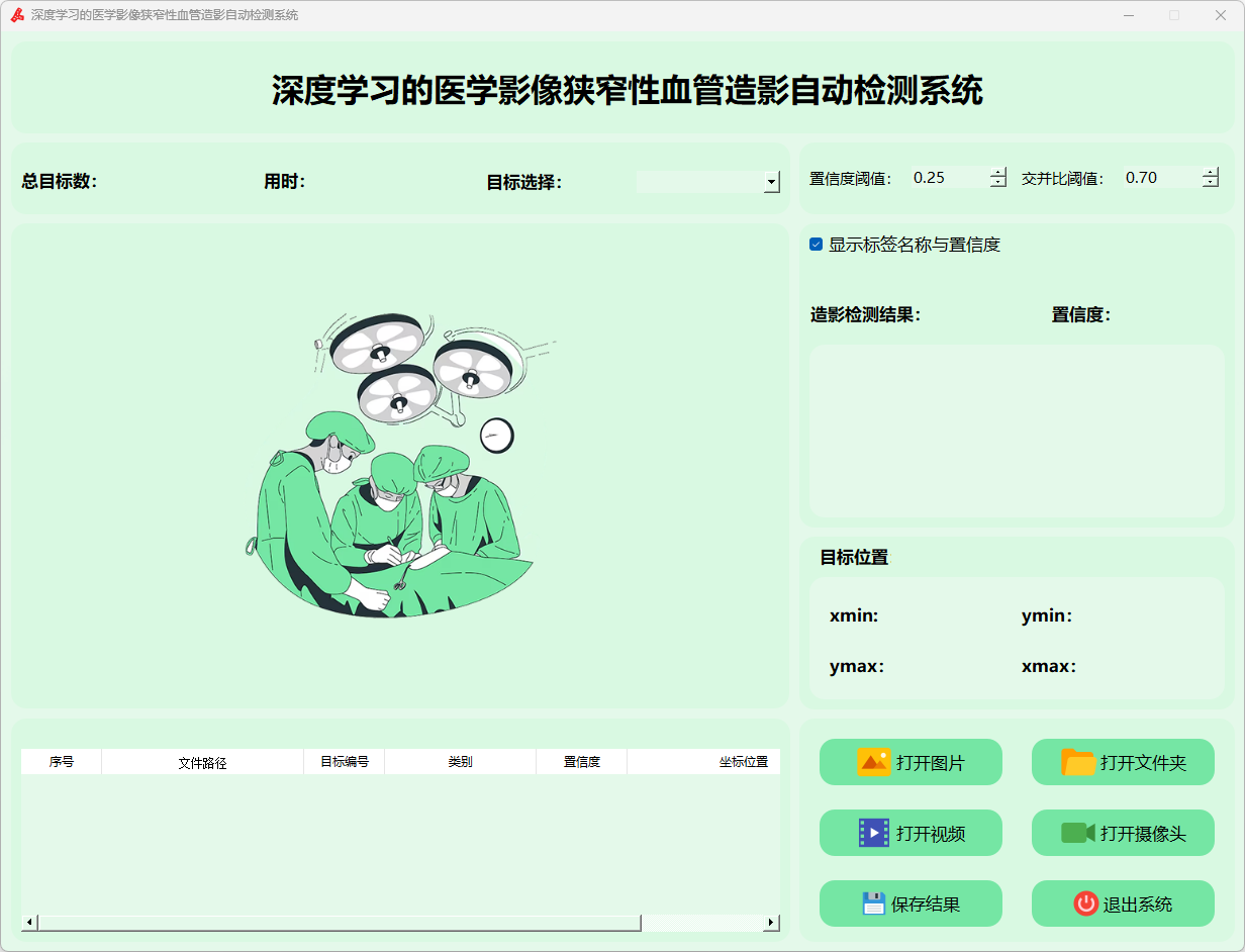 检测结果:系统连接摄像头进行实时分析,检测到狭窄血管图像并显示检测结果。实时显示摄像头画面,并将检测到的行为位置标注在图像上,表格下方记录了每一帧中检测结果的详细信息。