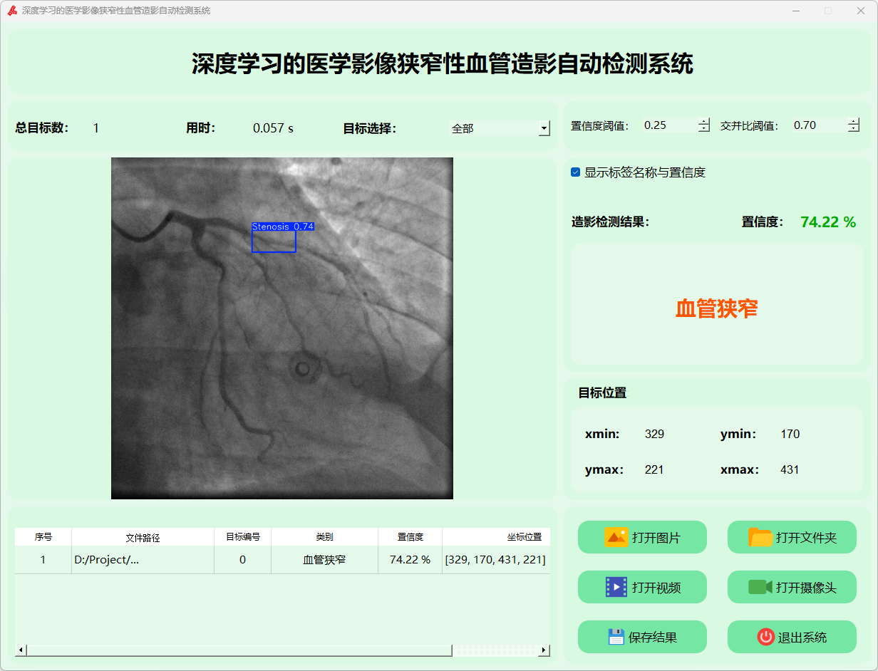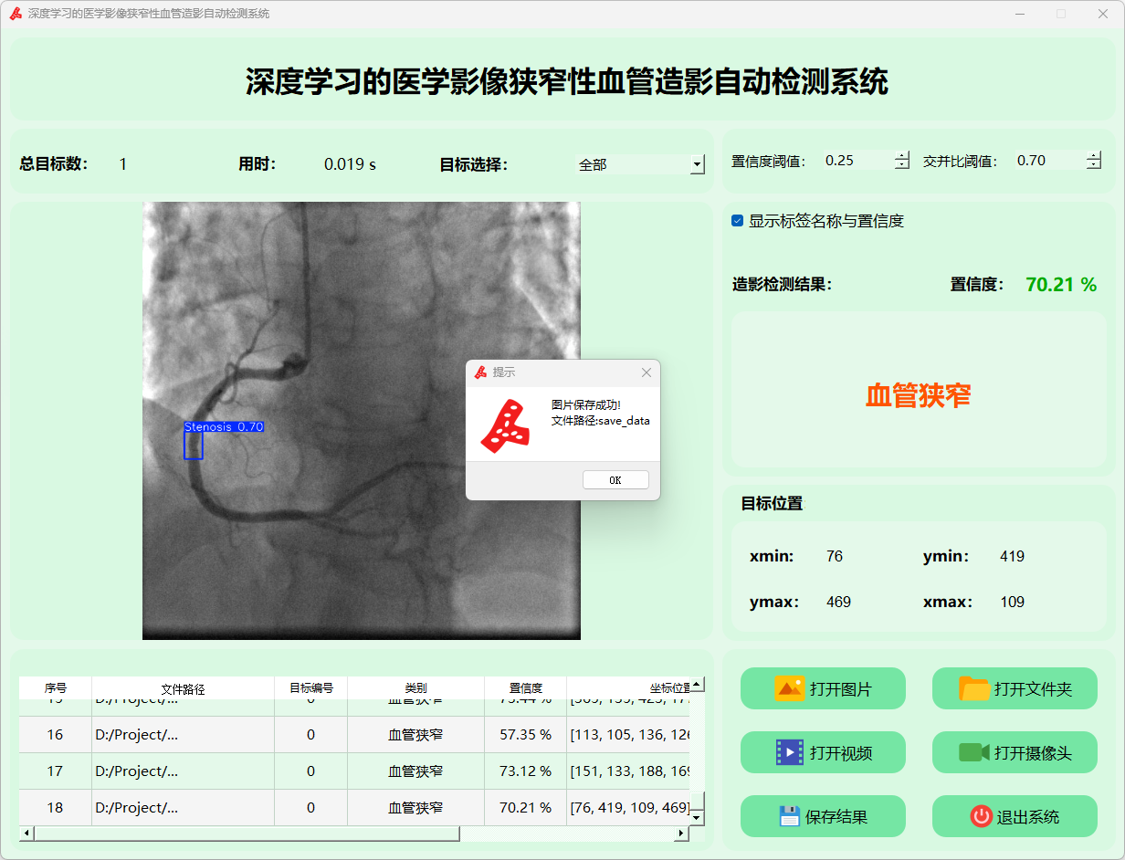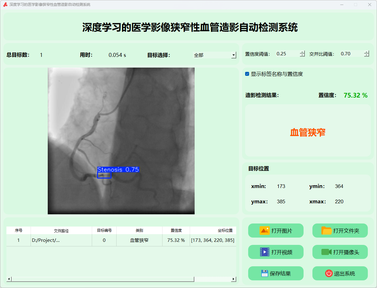 检测结果:系统识别出图片中的狭窄血管图像目标情况,并显示检测结果,包括总目标数、用时、目标类型、置信度、以及目标的位置坐标信息。