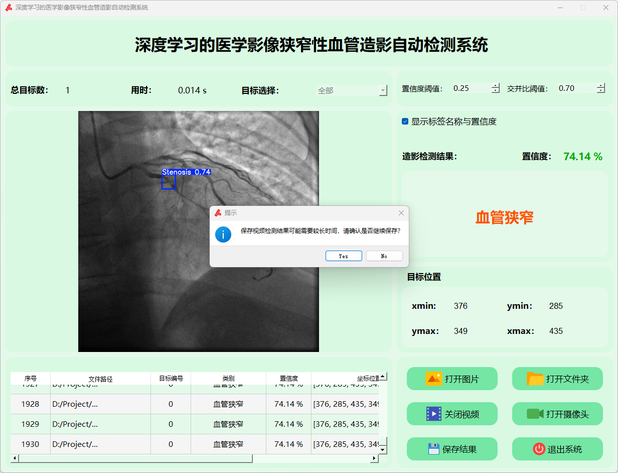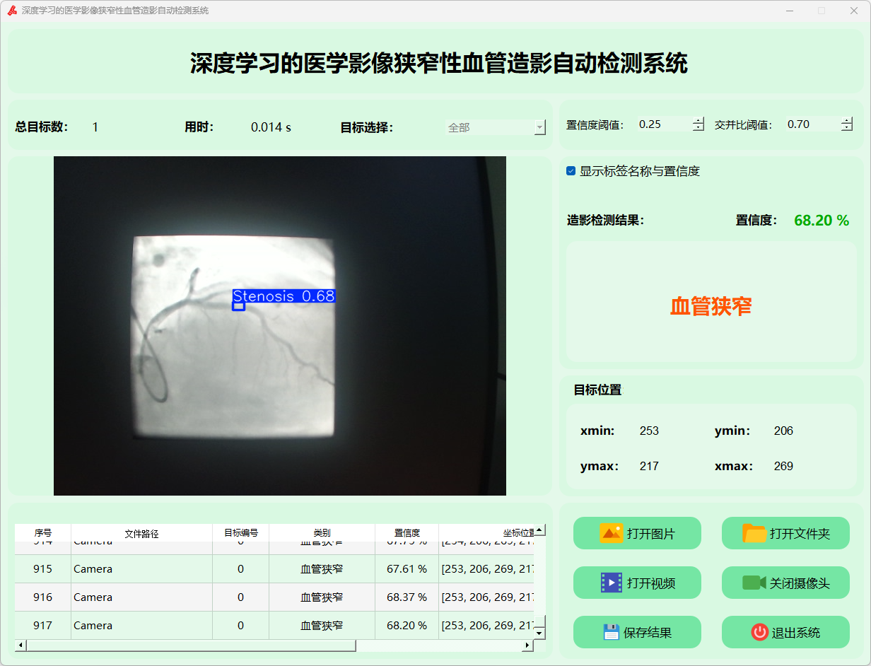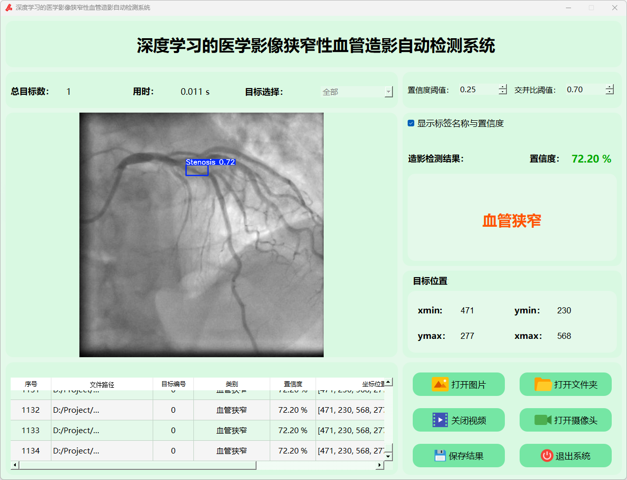 检测结果:系统对视频进行实时分析,检测到狭窄血管图像目标并显示检测结果。表格显示了视频中多个检测结果的置信度和位置信息。