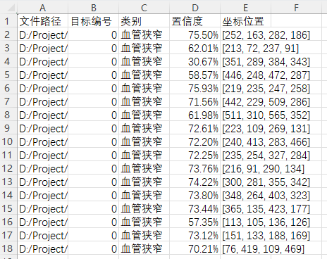 图片文件保存的csv文件内容如下,包括图片路径、目标在图片中的编号、目标类别、置信度、目标坐标位置。