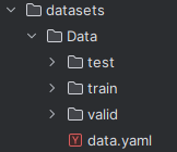 接着需要新建一个data.yaml文件,用于存储训练数据的路径及模型需要进行检测的类别。YOLOv8在进行模型训练时,会读取该文件的信息,用于进行模型的训练与验证。