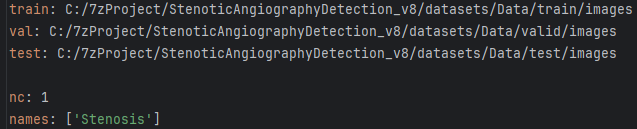 本研究使用了包含狭窄性血管造影图像目标的数据集,并通过 Labelimg 标注工具对每张图像中的目标边界框(Bounding Box)及其类别进行标注。基于此数据集,采用 YOLOv8n 模型进行训练。训练完成后,对模型在验证集上的表现进行了全面的性能评估与对比分析。整个模型训练与评估流程包括以下步骤:数据集准备、模型训练、模型评估。本次标注的目标类别主要集中于狭窄性血管造影图像目标。数据集总计包含 8325 张图像,具体分布如下: