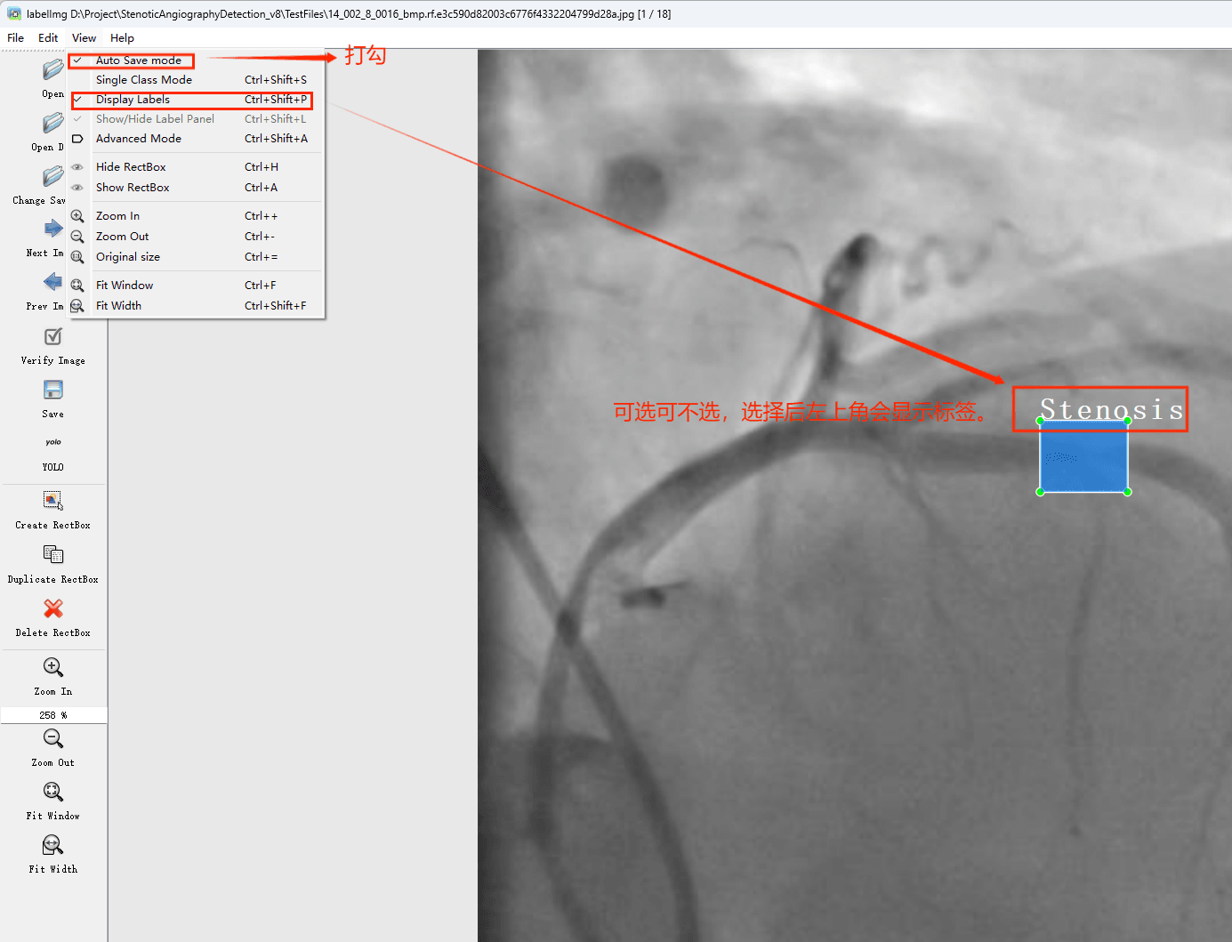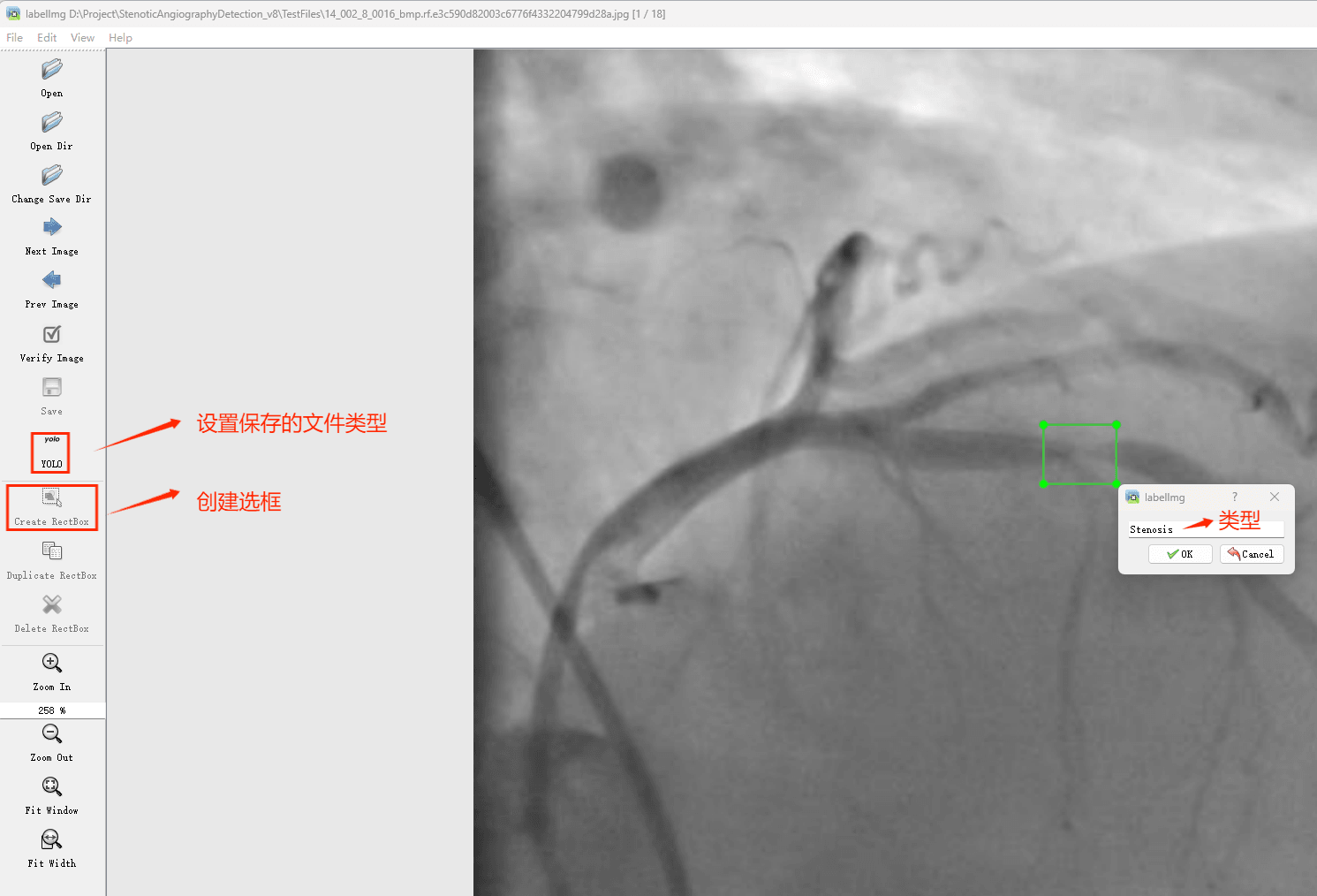 Tipps:通过搜集关于数据集为各种各样的狭窄性血管造影相关图像,并使用Labelimg标注工具对每张图片进行标注,分1检测类别,是’狭窄性血管造影’。