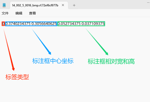 每一行代表标注的一个目标,通常包括五个数据,从左到右依次为:类别id、x_center、y_center、width、height。
