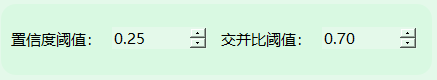 (2)交并比阈值:当前设置为0.70,表示系统只会认为交并比(IoU)超过70%的检测框为有效结果。交并比是检测框与真实框重叠区域的比值,用于衡量两个框的相似程度,值越高表明重叠程度越高。