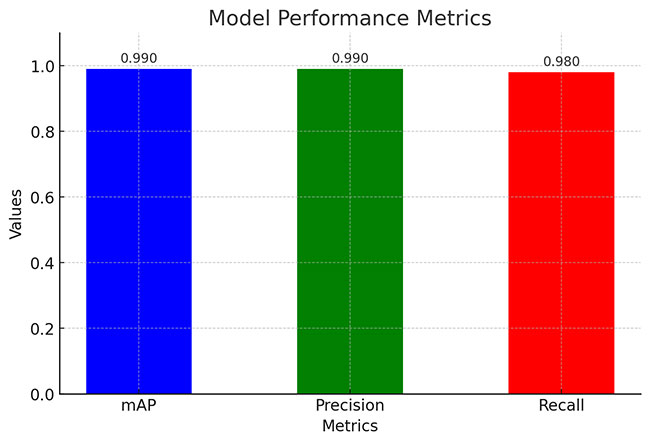 模型的性能指标 mAP 、Precision 和 Recall ,分别用蓝色、绿色和红色表示。所有指标都达到了较高水平,显示出模型的综合性能非常优秀。