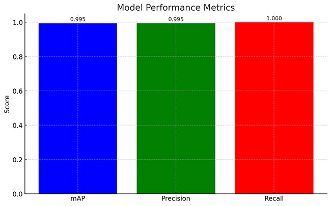 模型的性能指标 mAP 、Precision 和 Recall ,分别用蓝色、绿色和红色表示。所有指标都达到了较高水平,显示出模型的综合性能非常优秀。