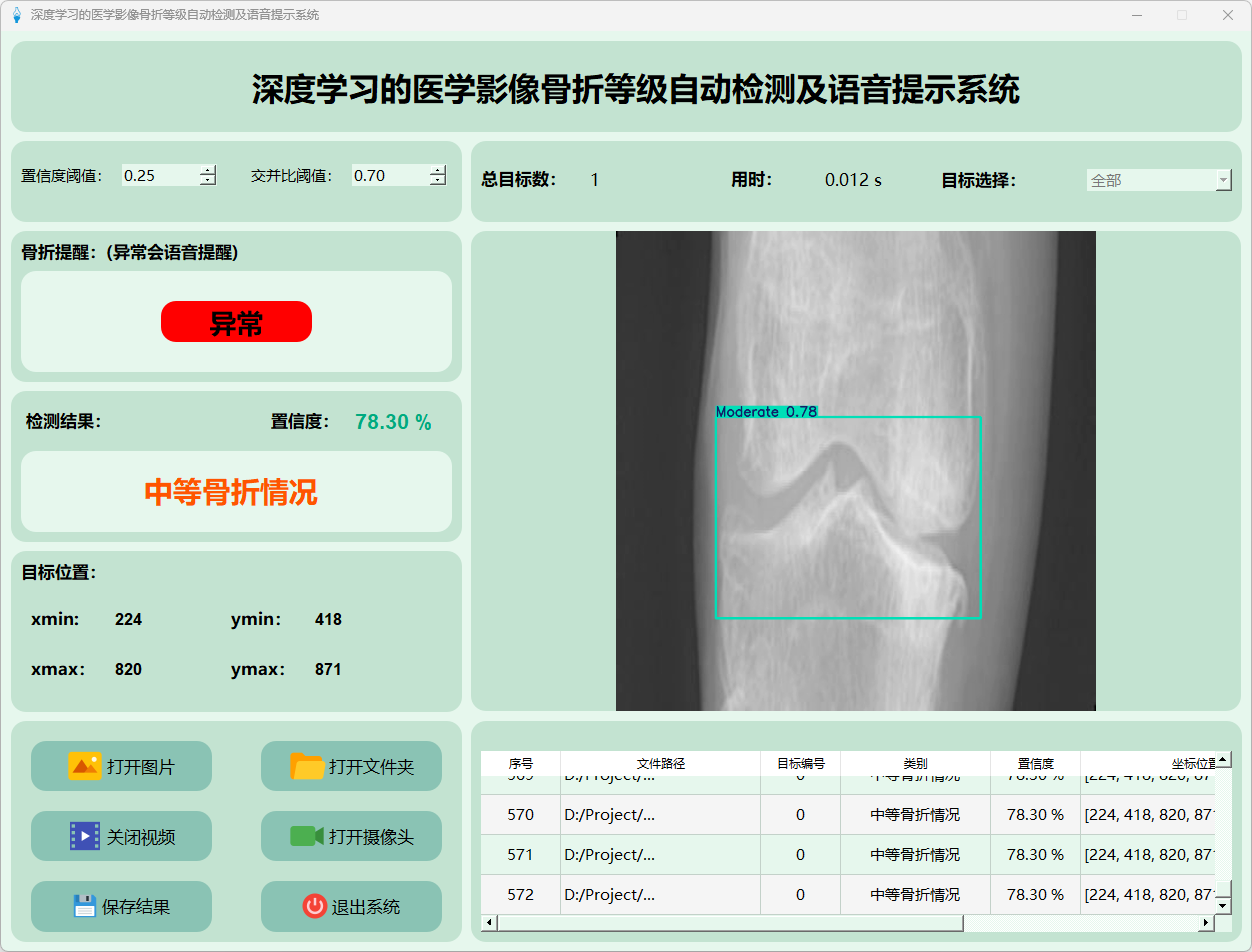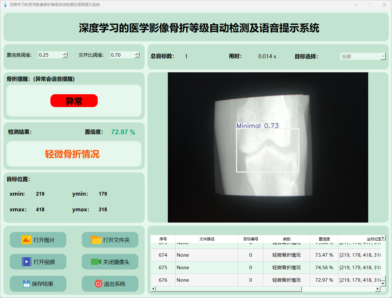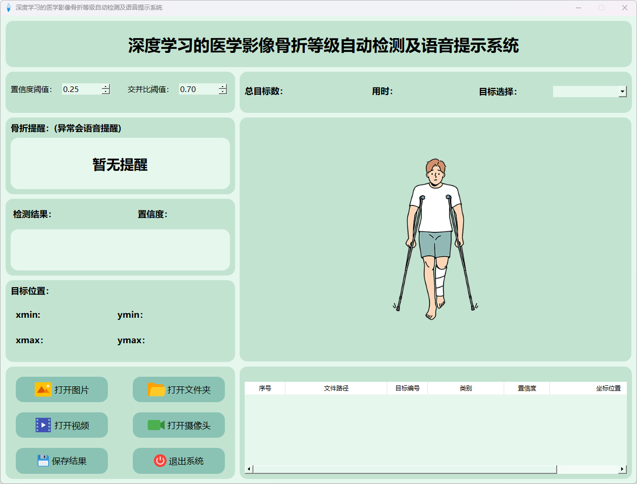 本研究还结合了PyQt5框架设计了用户友好的界面,为医生提供了便捷的操作体验。系统在检测到骨折类型时,除了在界面中展示检测结果外,还结合了语音提示功能。当系统识别出骨折的不同等级时,及时通过语音反馈提醒医生。这一语音提示功能不仅提升了系统的交互性和易用性,还减少了医生在紧张工作中的误操作,进一步加快了诊断过程。