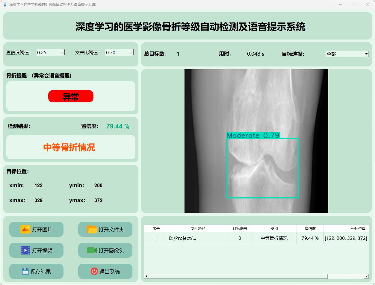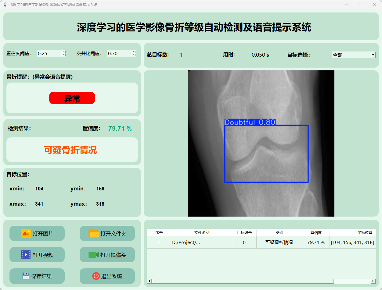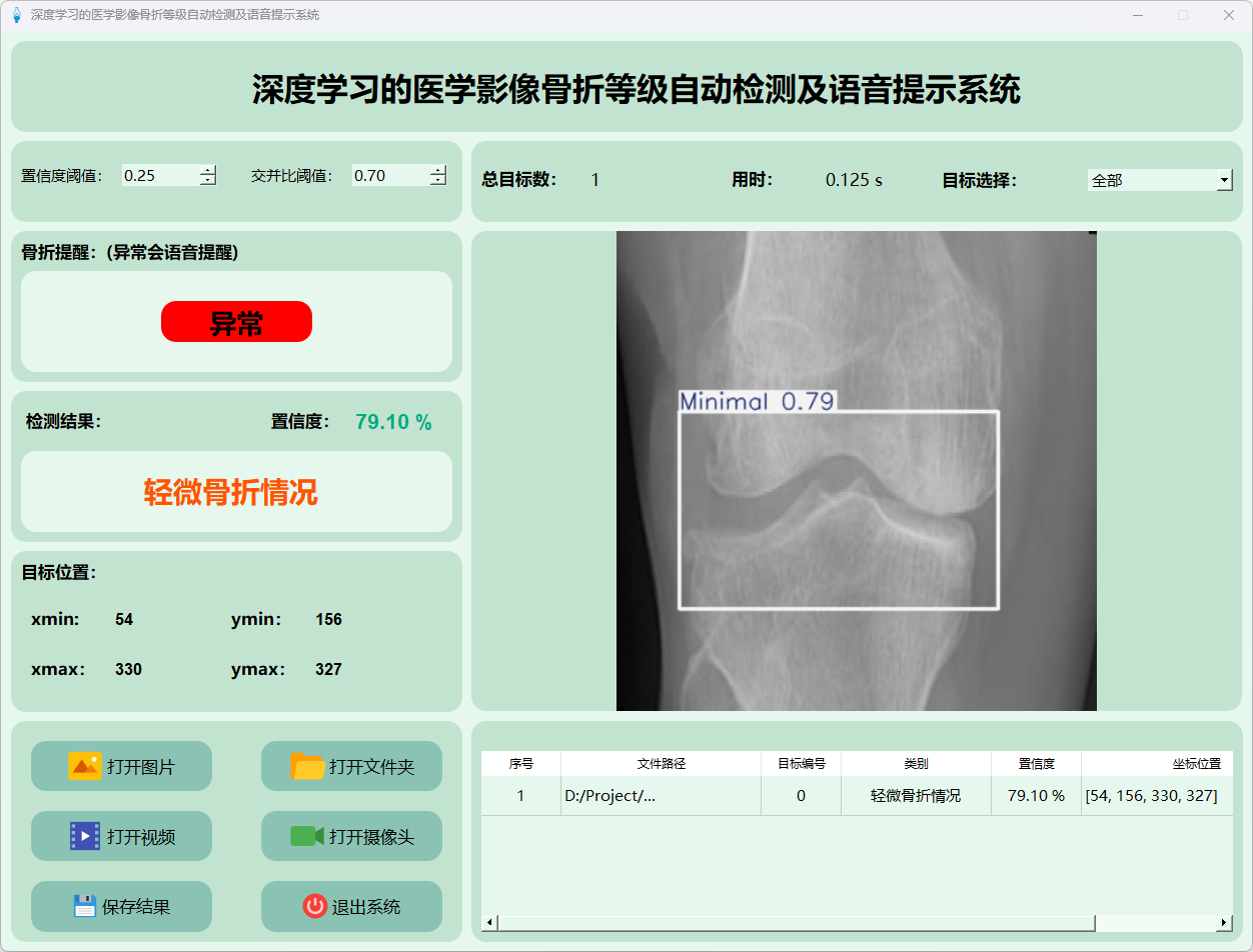 本研究还结合了PyQt5框架设计了用户友好的界面,为医生提供了便捷的操作体验。系统在检测到骨折类型时,除了在界面中展示检测结果外,还结合了语音提示功能。当系统识别出骨折的不同等级时,及时通过语音反馈提醒医生。这一语音提示功能不仅提升了系统的交互性和易用性,还减少了医生在紧张工作中的误操作,进一步加快了诊断过程。