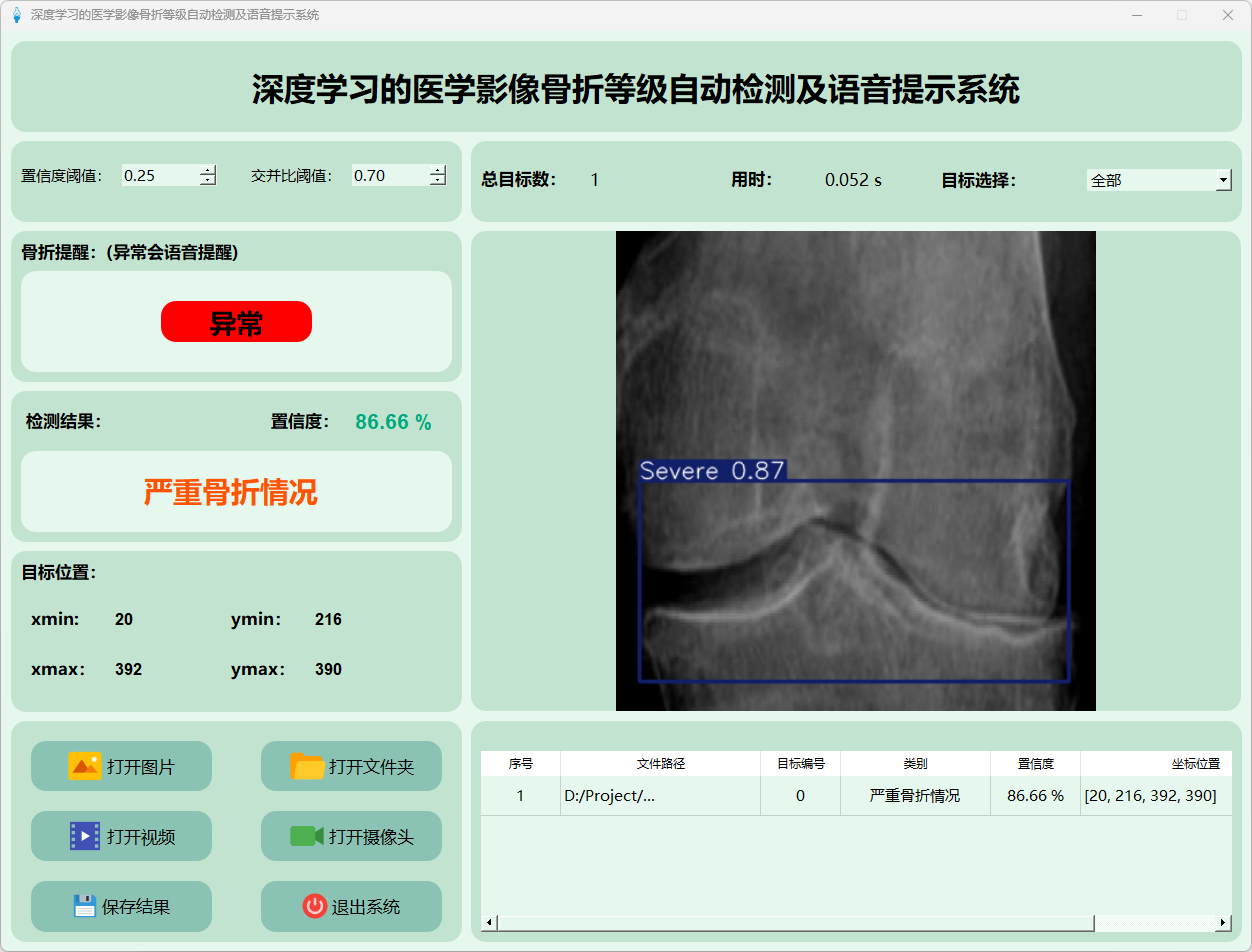 结果(Result):“严重骨折情况”,表示系统正在高亮显示检测到的“Severe”。