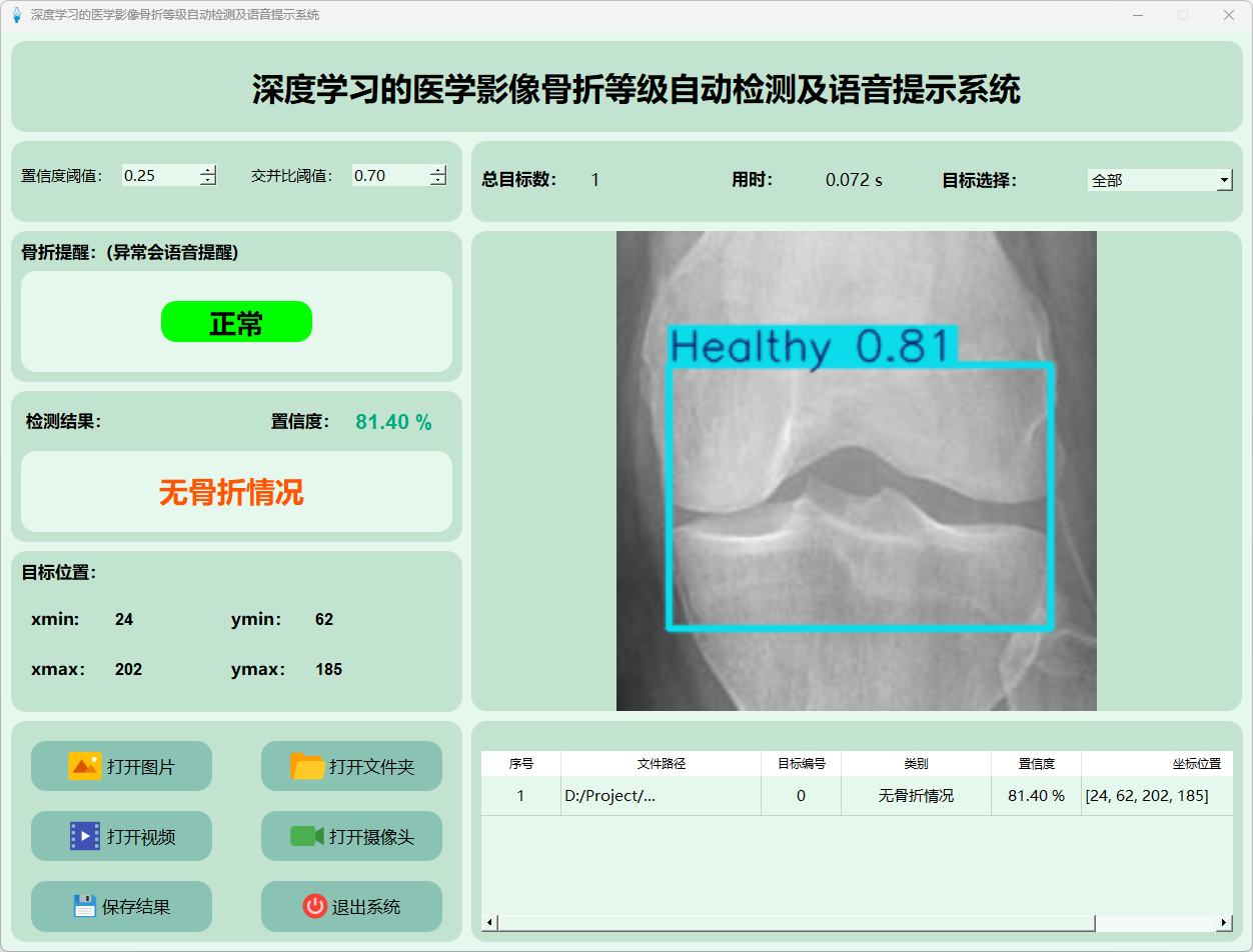 检测结果:系统识别出图片中的骨折情况,并显示检测结果,包括总目标数、用时、目标类型、置信度、以及目标的位置坐标信息。