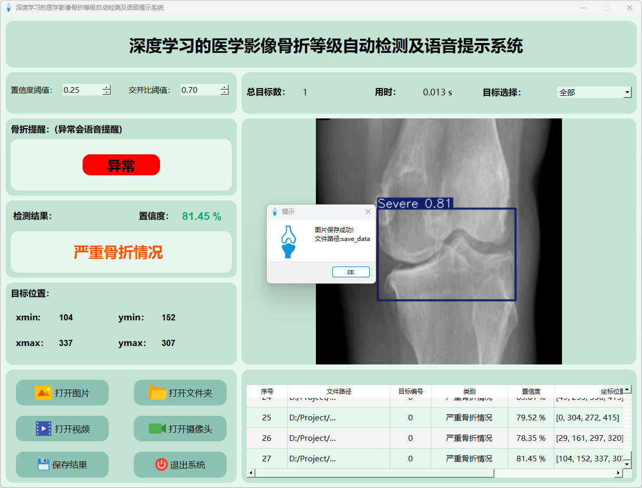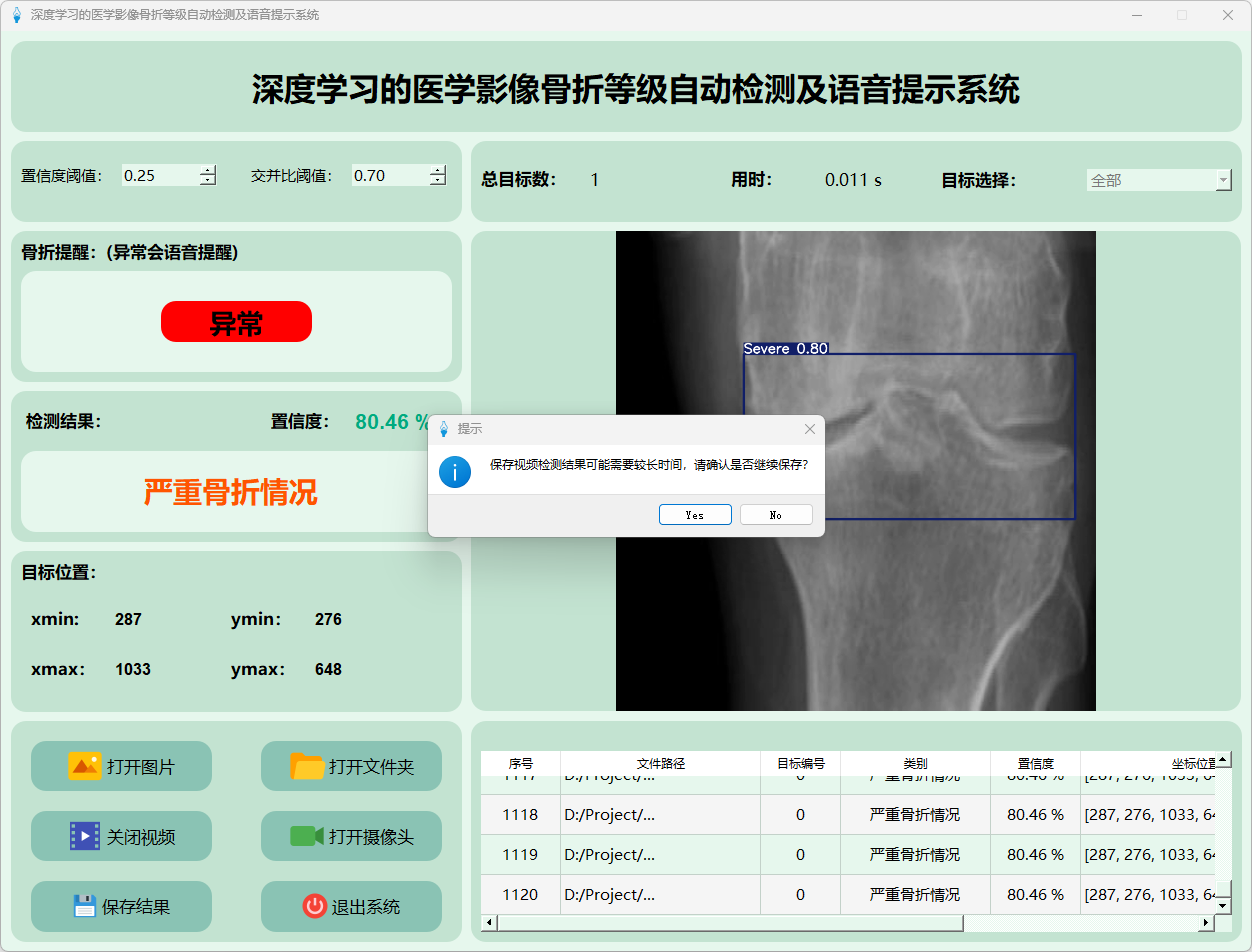 检测结果:系统对视频进行实时分析,检测到骨折情况检测结果。表格显示了视频中多个检测结果的置信度和位置信息。