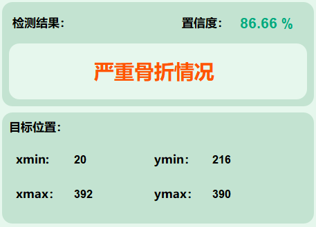 (1)这表示模型对检测到的目标属于“严重骨折情况”类别的置信度为86.66%。