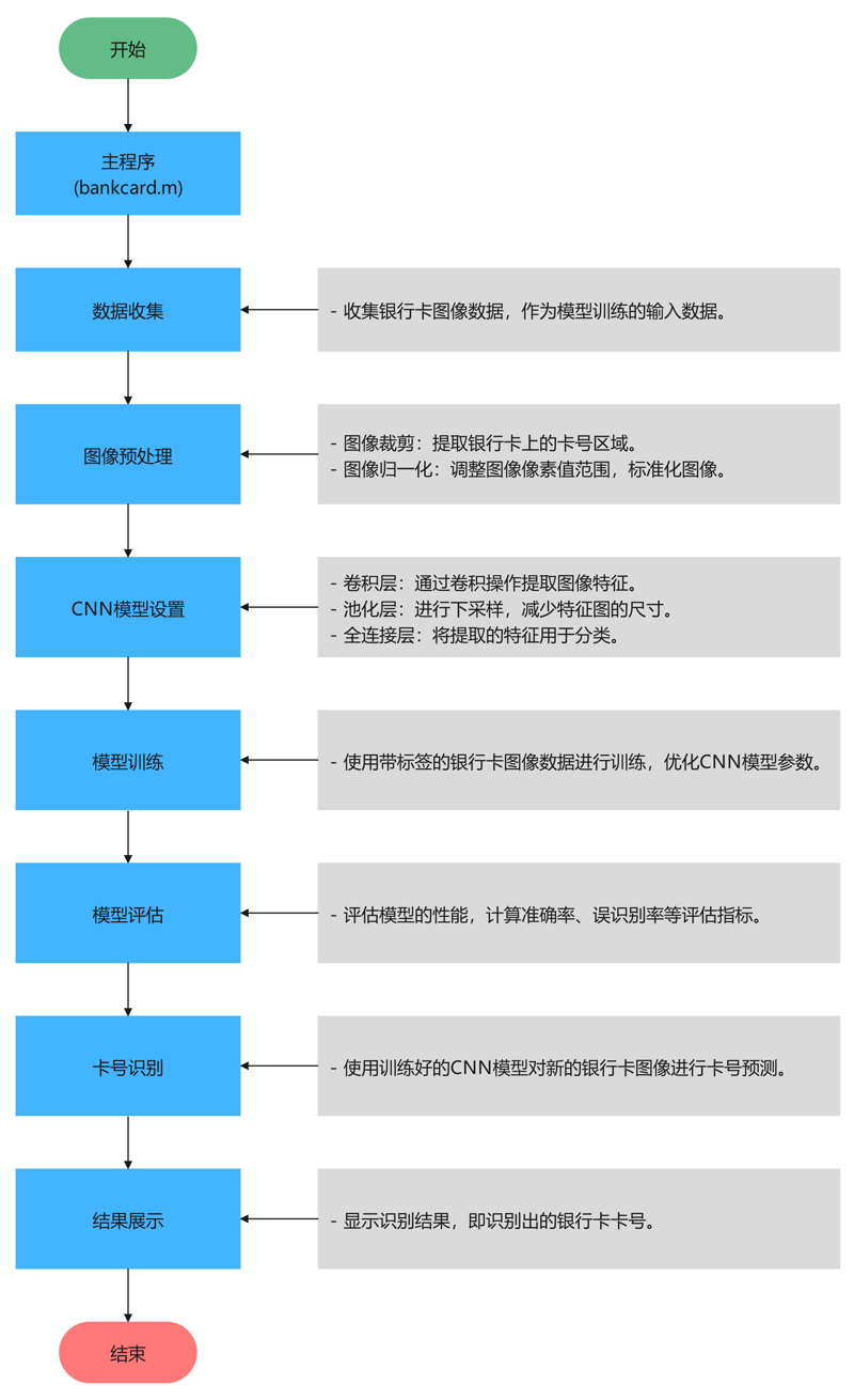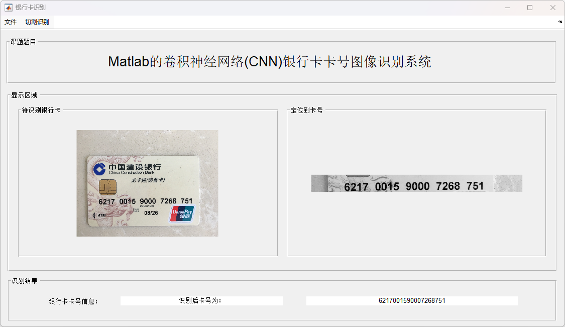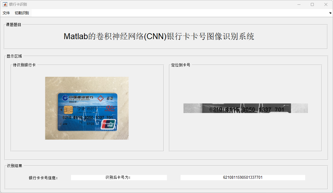 随着信息技术的快速发展,银行卡作为一种重要的支付工具,广泛应用于日常生活中的支付、转账等活动。银行卡卡号的自动识别在银行业务和金融安全中起着至关重要的作用。本文提出了一种基于卷积神经网络(CNN)和MATLAB平台的银行卡卡号图像识别系统。该系统通过深度学习模型,自动识别银行卡图像中的卡号信息,具有较高的准确性和鲁棒性。