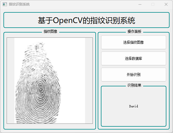 随着生物特征识别技术的快速发展,指纹识别作为最广泛应用的身份验证方式之一,在安全领域、门禁系统及考勤管理等方面发挥着重要作用。本文基于 PyQt5 和 OpenCV 设计并实现了一种指纹识别系统,该系统提供了友好的 图形用户界面 (GUI),并结合 SIFT (Scale-Invariant Feature Transform) 算法 进行指纹特征提取和匹配,实现身份识别。