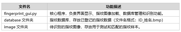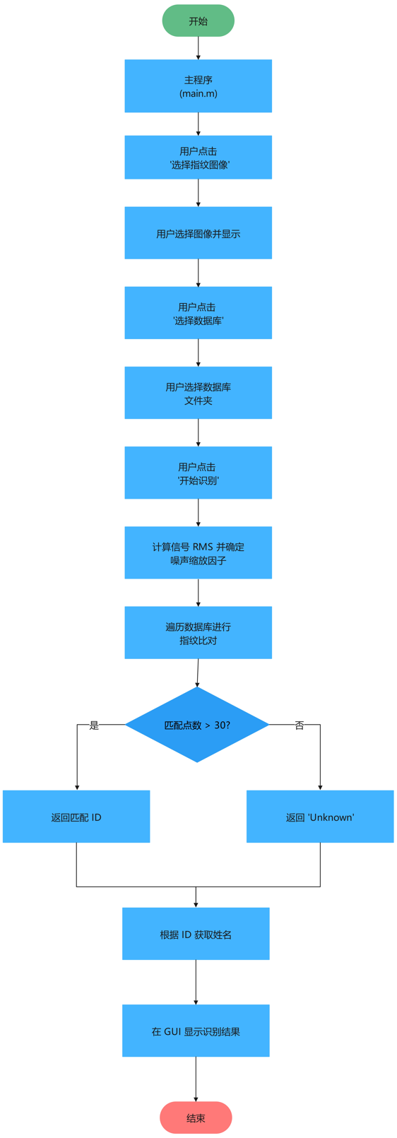 系统主要由 图像加载、数据库管理、指纹特征比对及识别结果显示 等功能模块组成。用户可通过 PyQt5 界面选择待识别的指纹图像,并与数据库中的指纹模板进行比对,系统通过 FLANN (Fast Library for Approximate Nearest Neighbors) 匹配算法 计算匹配点数,从而判断身份。当匹配点数超过设定阈值时,系统返回对应身份信息,否则显示“Unknown”。