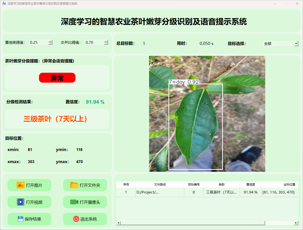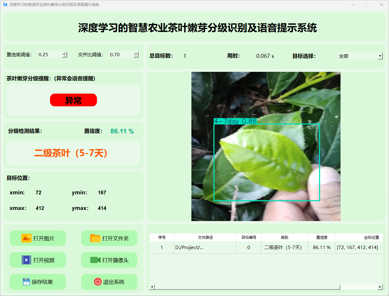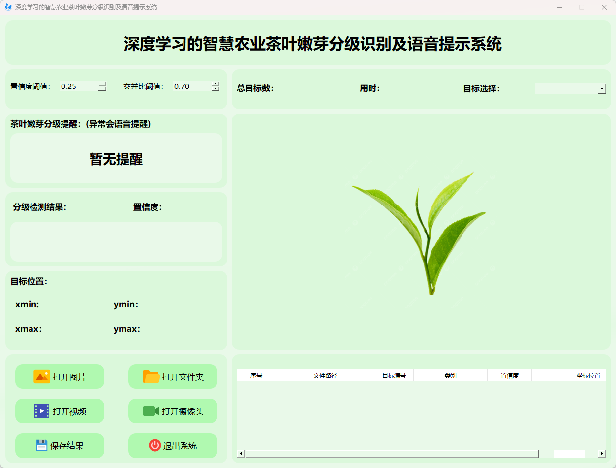 综上所述,该基于YOLOv8的茶叶嫩芽分级识别及语音提示系统不仅为茶叶质量控制提供了一种高效的自动化解决方案,同时也为传统农业的智能化升级和精准管理开辟了新的技术路径。该研究的成功实施具有重要的理论意义和广阔的应用前景,为进一步深入开展基于深度学习的农业智能化研究提供了宝贵经验。