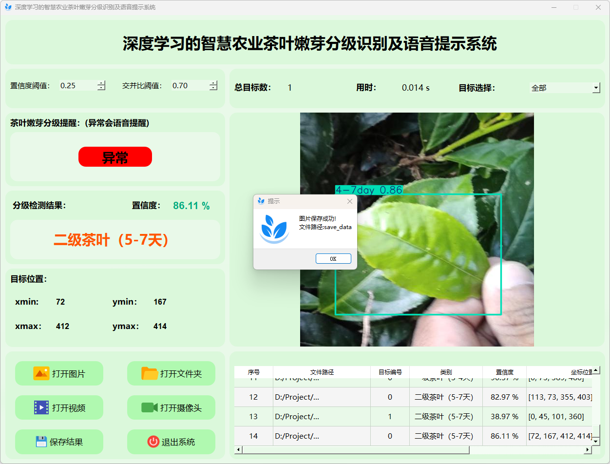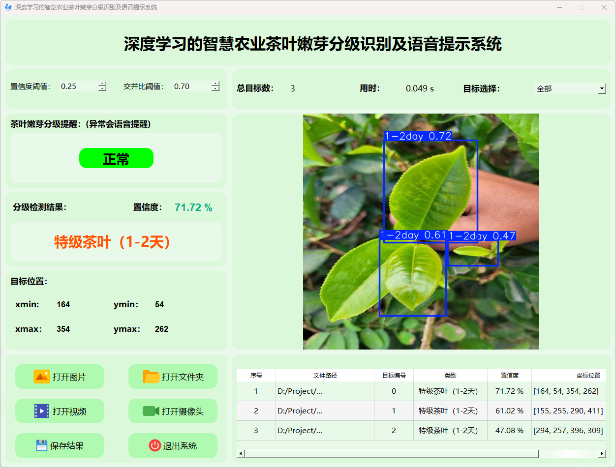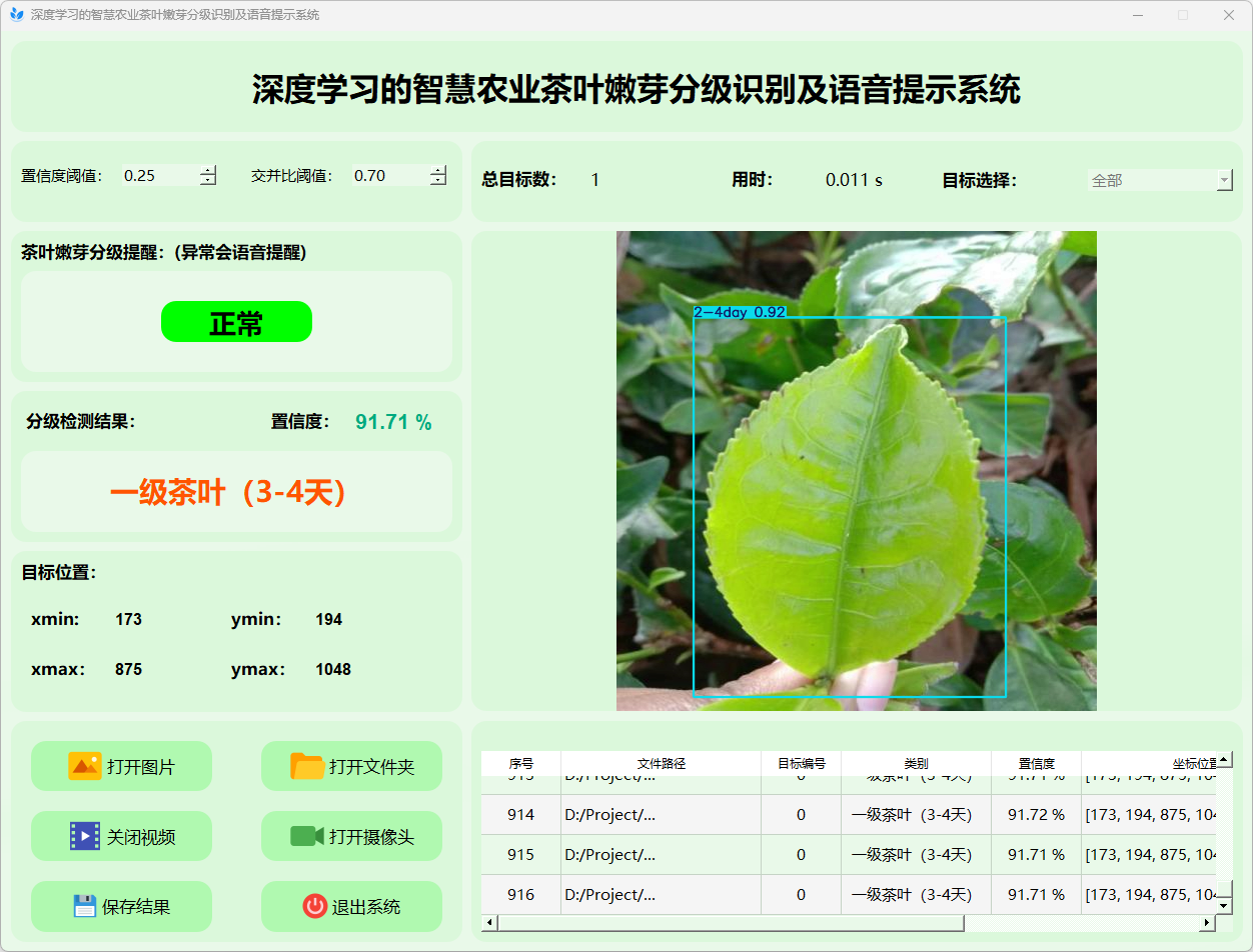 综上所述,该基于YOLOv8的茶叶嫩芽分级识别及语音提示系统不仅为茶叶质量控制提供了一种高效的自动化解决方案,同时也为传统农业的智能化升级和精准管理开辟了新的技术路径。该研究的成功实施具有重要的理论意义和广阔的应用前景,为进一步深入开展基于深度学习的农业智能化研究提供了宝贵经验。