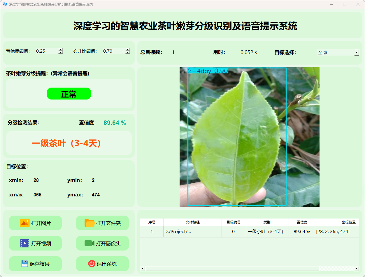 检测结果:系统识别出图片中的茶叶嫩芽分级情况,并显示检测结果,包括总目标数、用时、目标类型、置信度、以及目标的位置坐标信息。