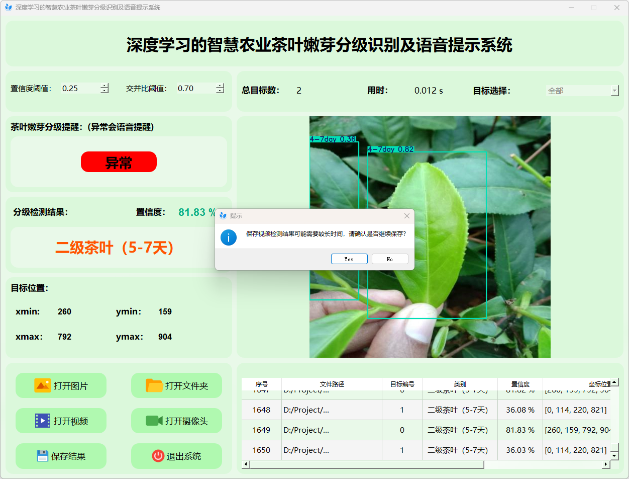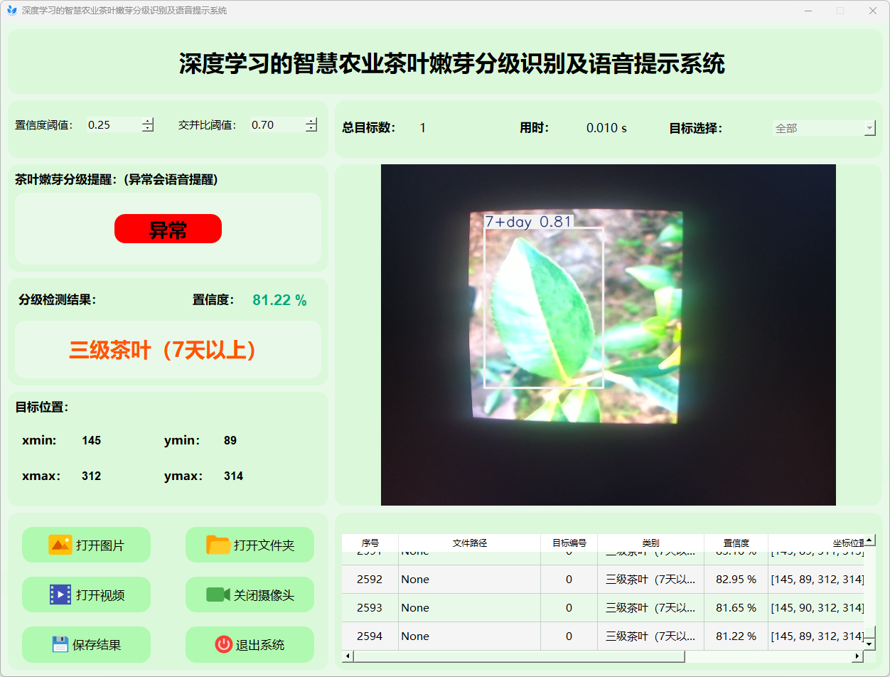 检测结果:系统对视频进行实时分析,检测到茶叶嫩芽分级情况检测结果。表格显示了视频中多个检测结果的置信度和位置信息。