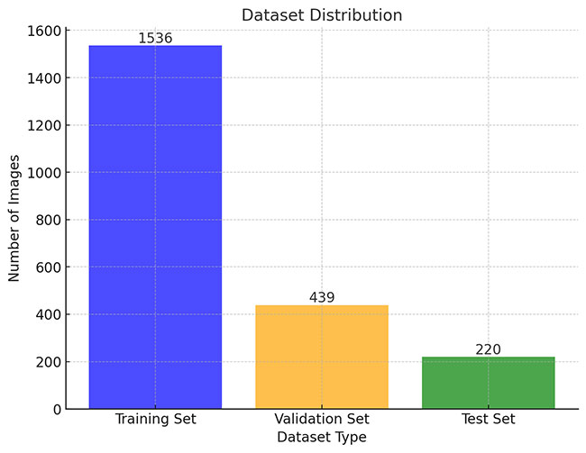 以下柱状图展示了训练集、验证集和测试集的图像数量分布: