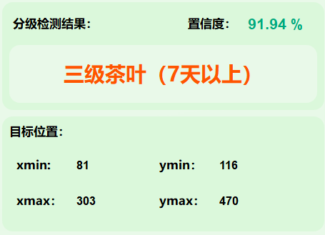 这些坐标表示在图像中的目标区域范围,框定了检测到的“三级茶叶(7天以上)”的位置。