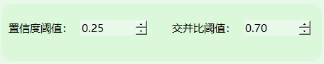 (2)交并比阈值:当前设置为0.70,表示系统只会认为交并比(IoU)超过70%的检测框为有效结果。交并比是检测框与真实框重叠区域的比值,用于衡量两个框的相似程度,值越高表明重叠程度越高。