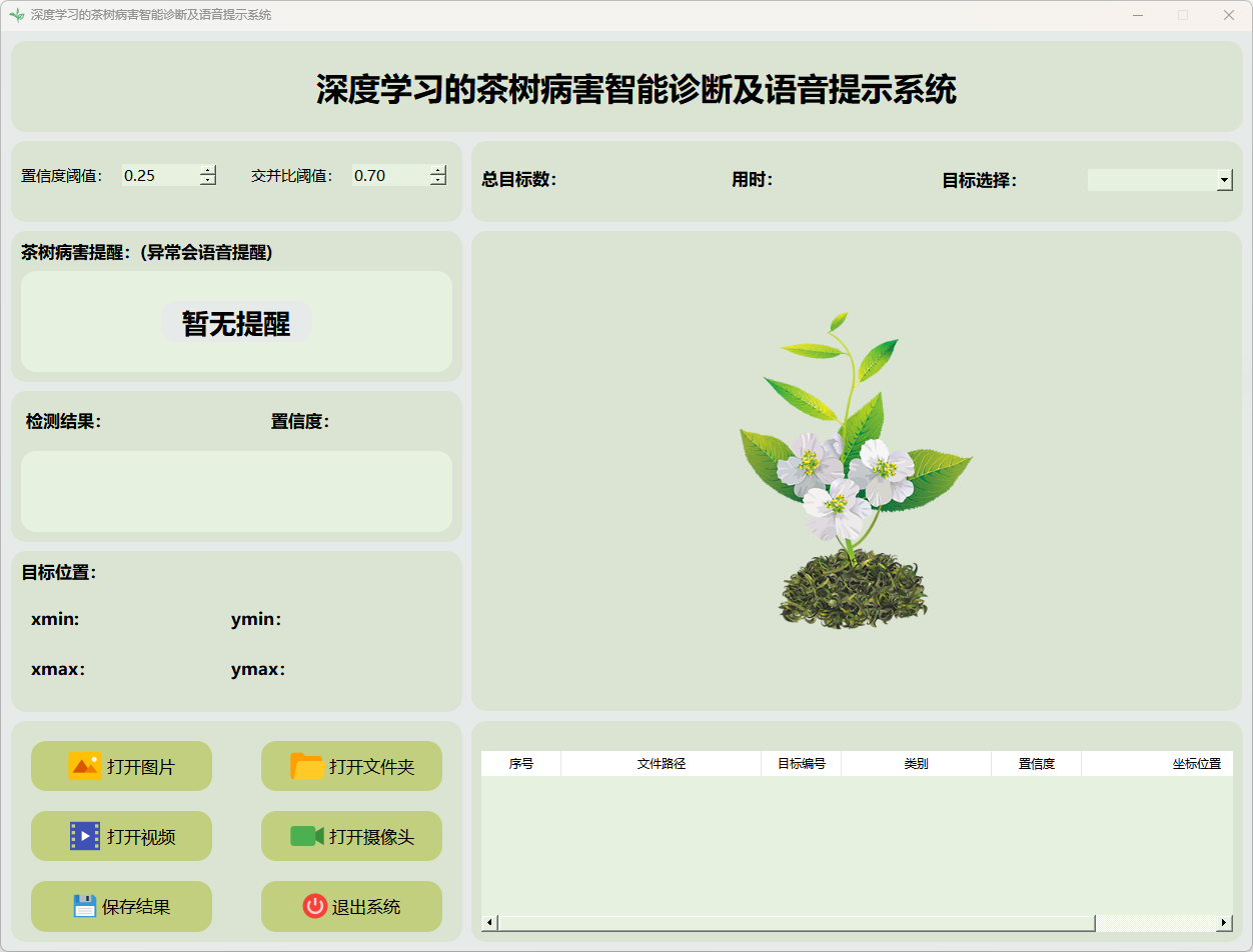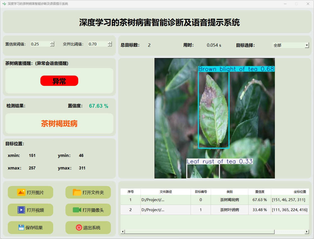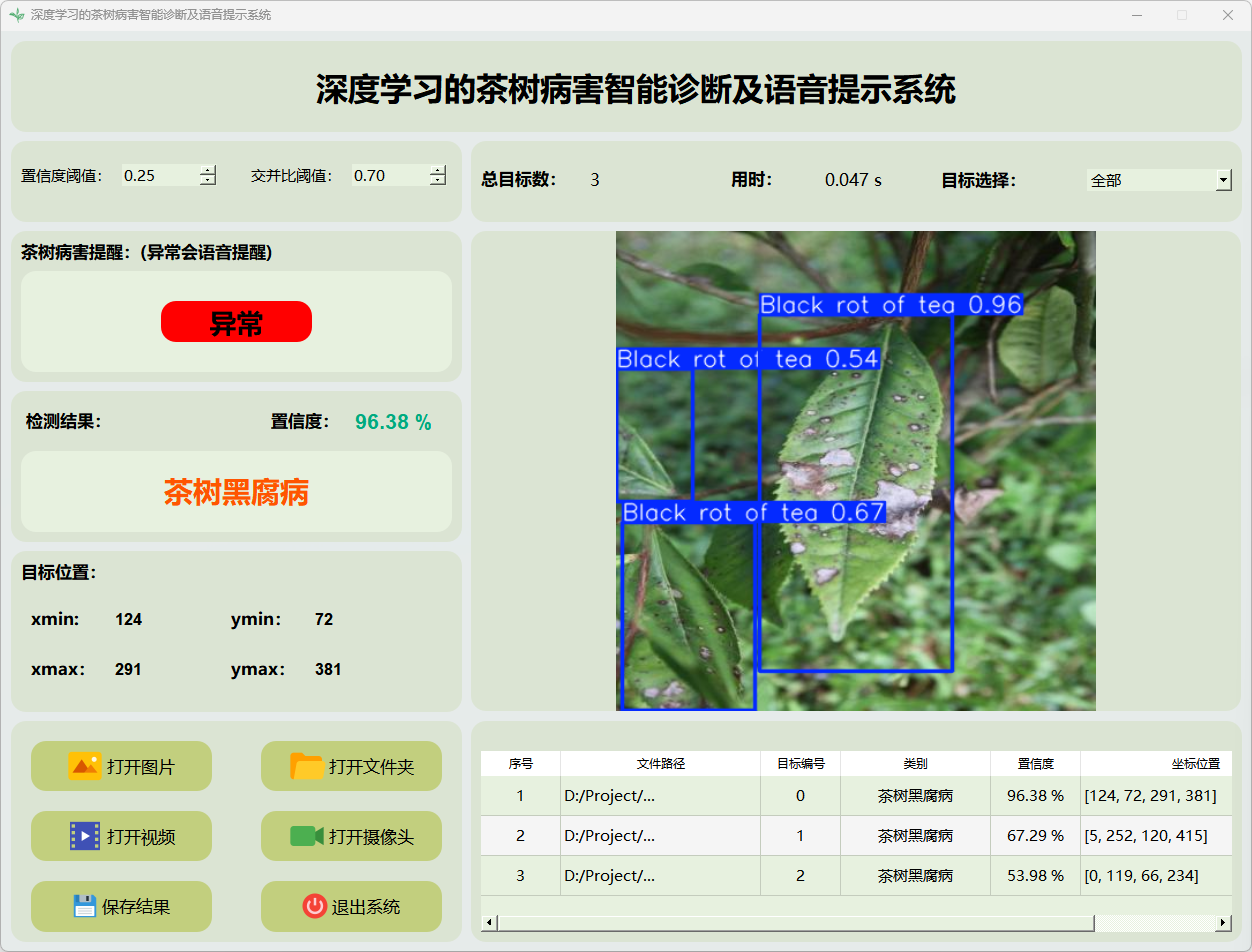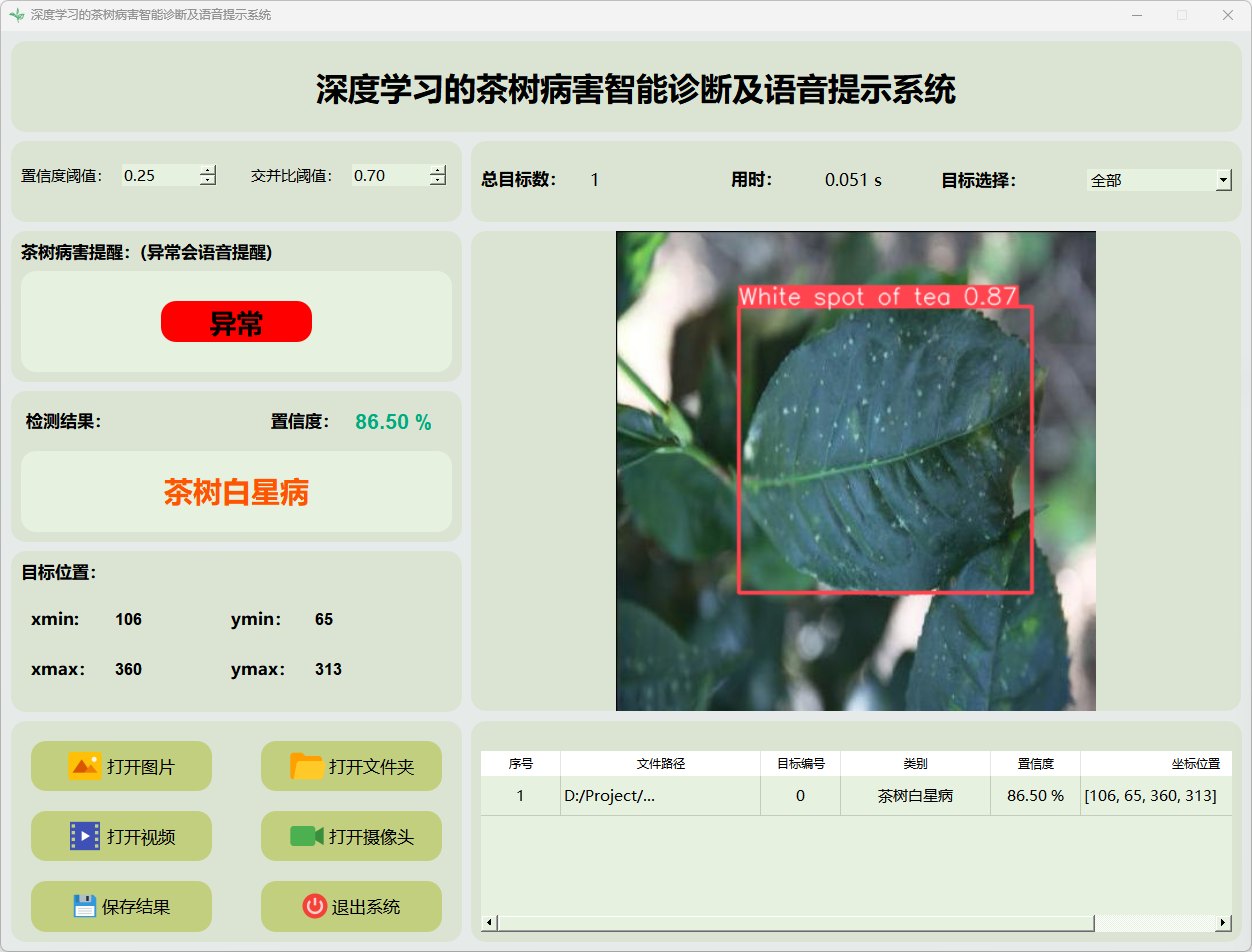 该系统支持用户通过图像上传或实时摄像头输入茶树叶片图像,界面直观,操作便捷,检测结果可实时显示,并通过语音提示功能辅助用户快速获取诊断信息,降低农业从业者的技术门槛。该研究为茶树病害的自动化诊断提供了一种可行的解决方案,为智能农业的发展提供了新的思路。未来工作将进一步优化系统性能,扩展病害种类,并探索在移动端或无人机监测中的应用。