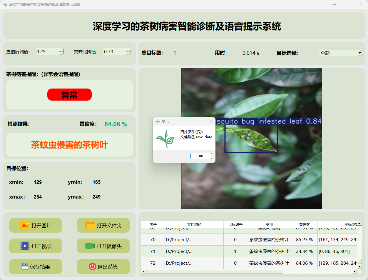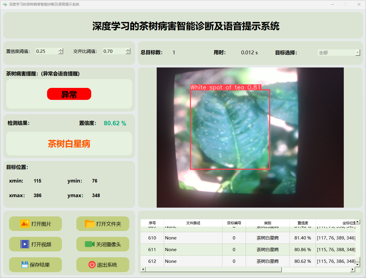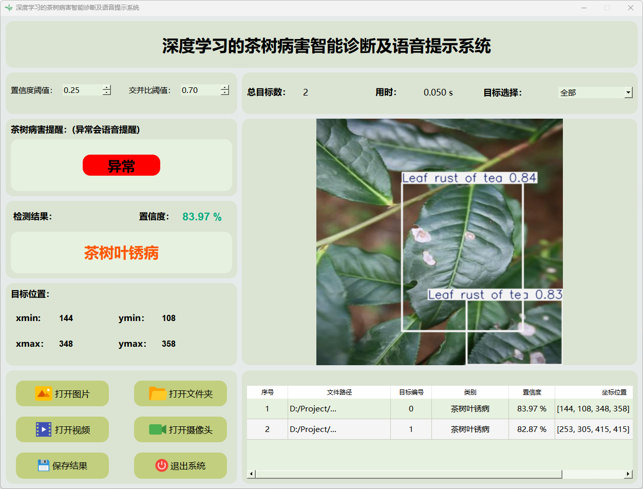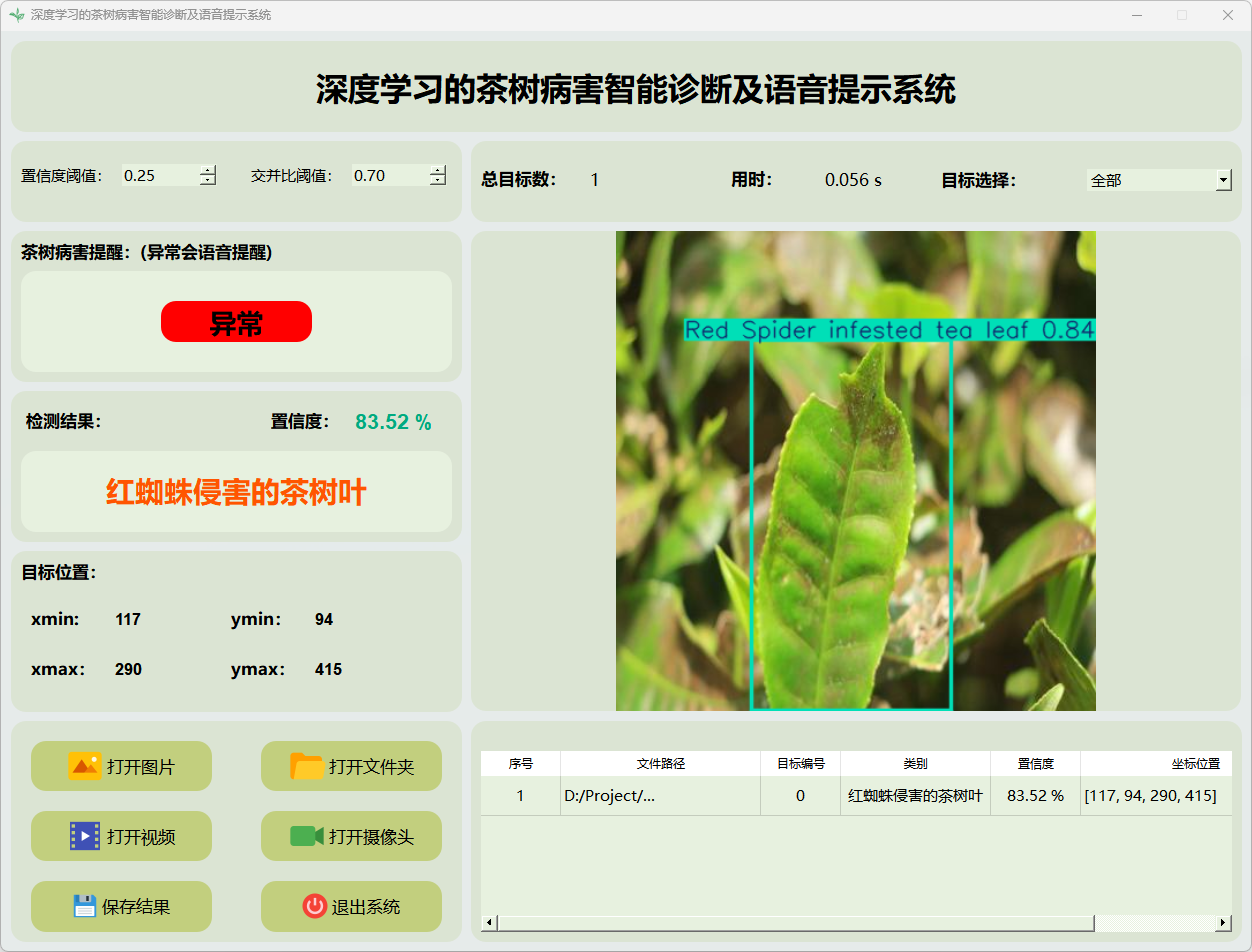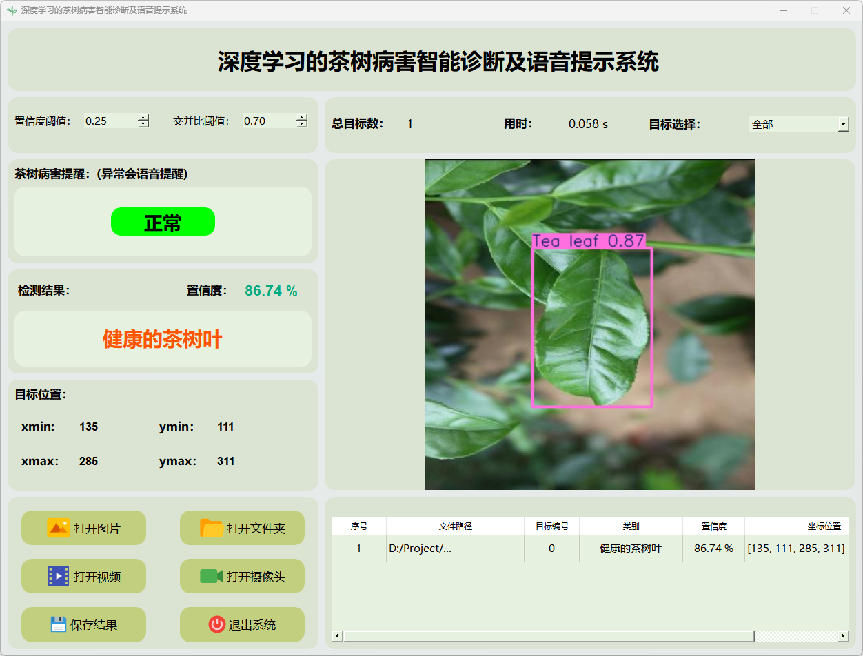 该系统支持用户通过图像上传或实时摄像头输入茶树叶片图像,界面直观,操作便捷,检测结果可实时显示,并通过语音提示功能辅助用户快速获取诊断信息,降低农业从业者的技术门槛。该研究为茶树病害的自动化诊断提供了一种可行的解决方案,为智能农业的发展提供了新的思路。未来工作将进一步优化系统性能,扩展病害种类,并探索在移动端或无人机监测中的应用。