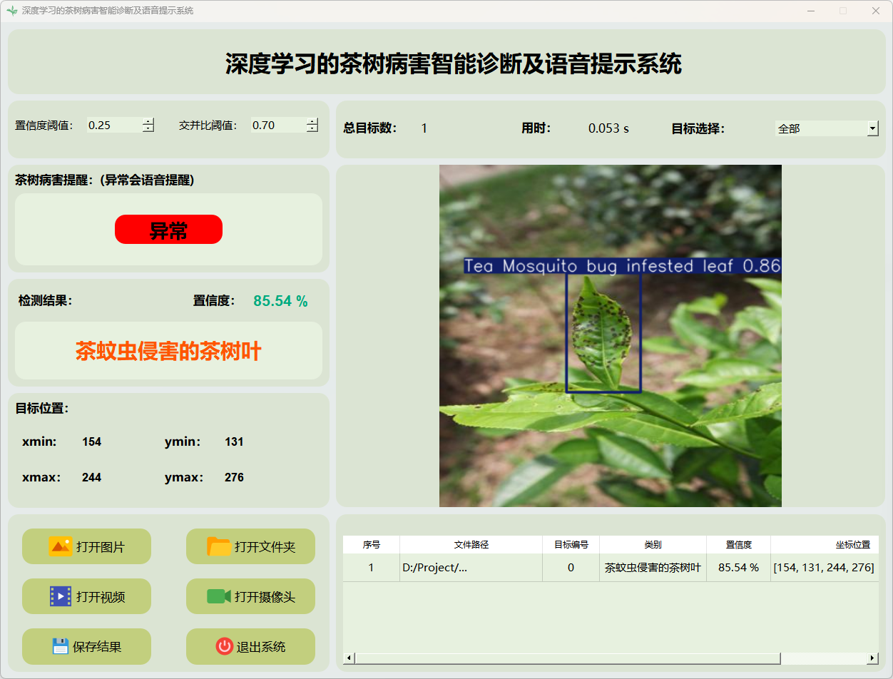 检测结果:系统识别出图片中的茶树病害情况,并显示检测结果,包括总目标数、用时、目标类型、置信度、以及目标的位置坐标信息。