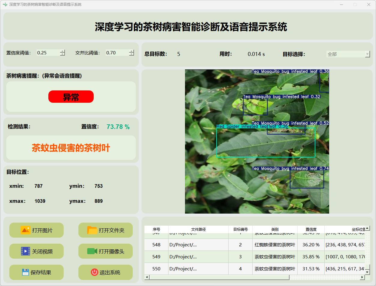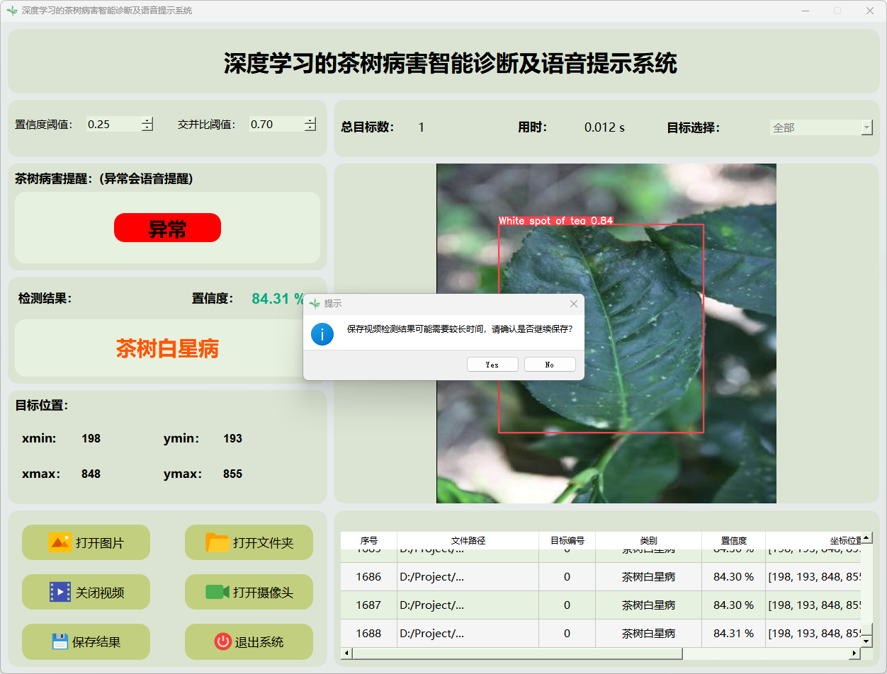 检测结果:系统对视频进行实时分析,检测到茶树病害情况检测结果。表格显示了视频中多个检测结果的置信度和位置信息。