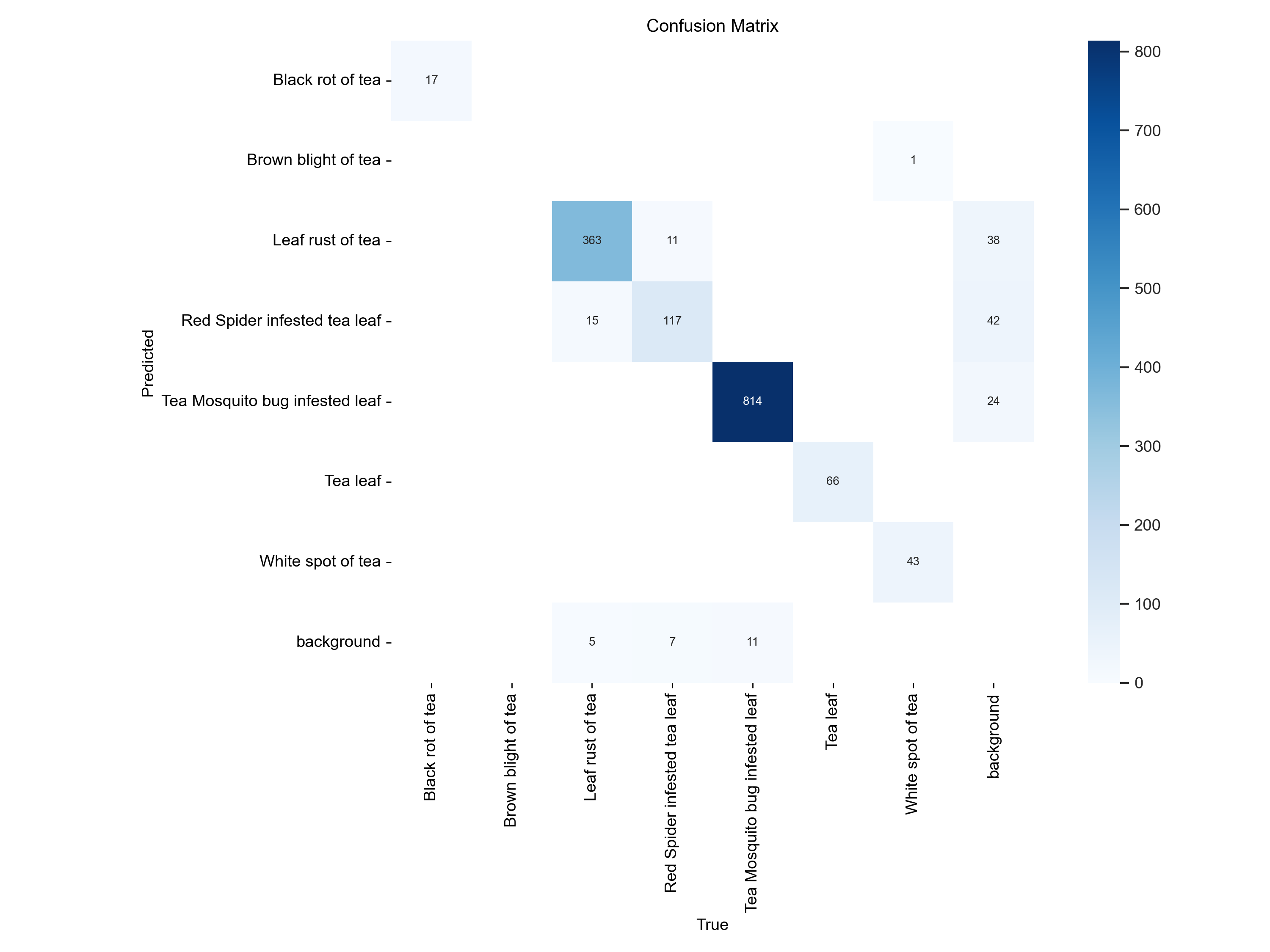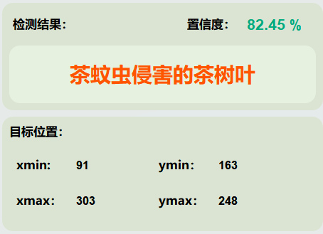 (1)这表示模型对检测到的目标属于“茶蚊虫侵害的茶树叶”类别的置信度为82.45%。