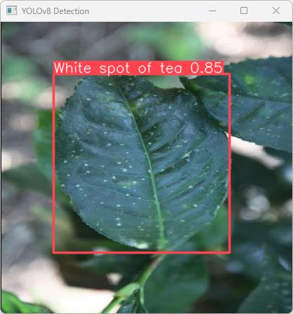 YOLOv8 成功检测到 茶树白星病(White spot of tea),推理速度快,结果已保存至 runs/detect/predict,可进一步优化模型提升准确性。
