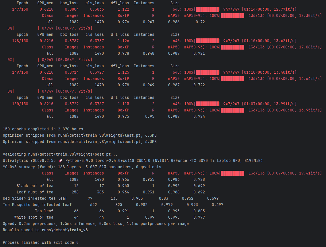 YOLOv8 训练成功,mAP50 达 98.6%,mAP50-95 达 72.4%,检测精度高、推理速度快(2.7ms/张),适用于实时茶树病害识别,可进入测试与优化阶段。