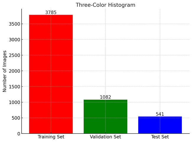 以下柱状图展示了训练集、验证集和测试集的图像数量分布: