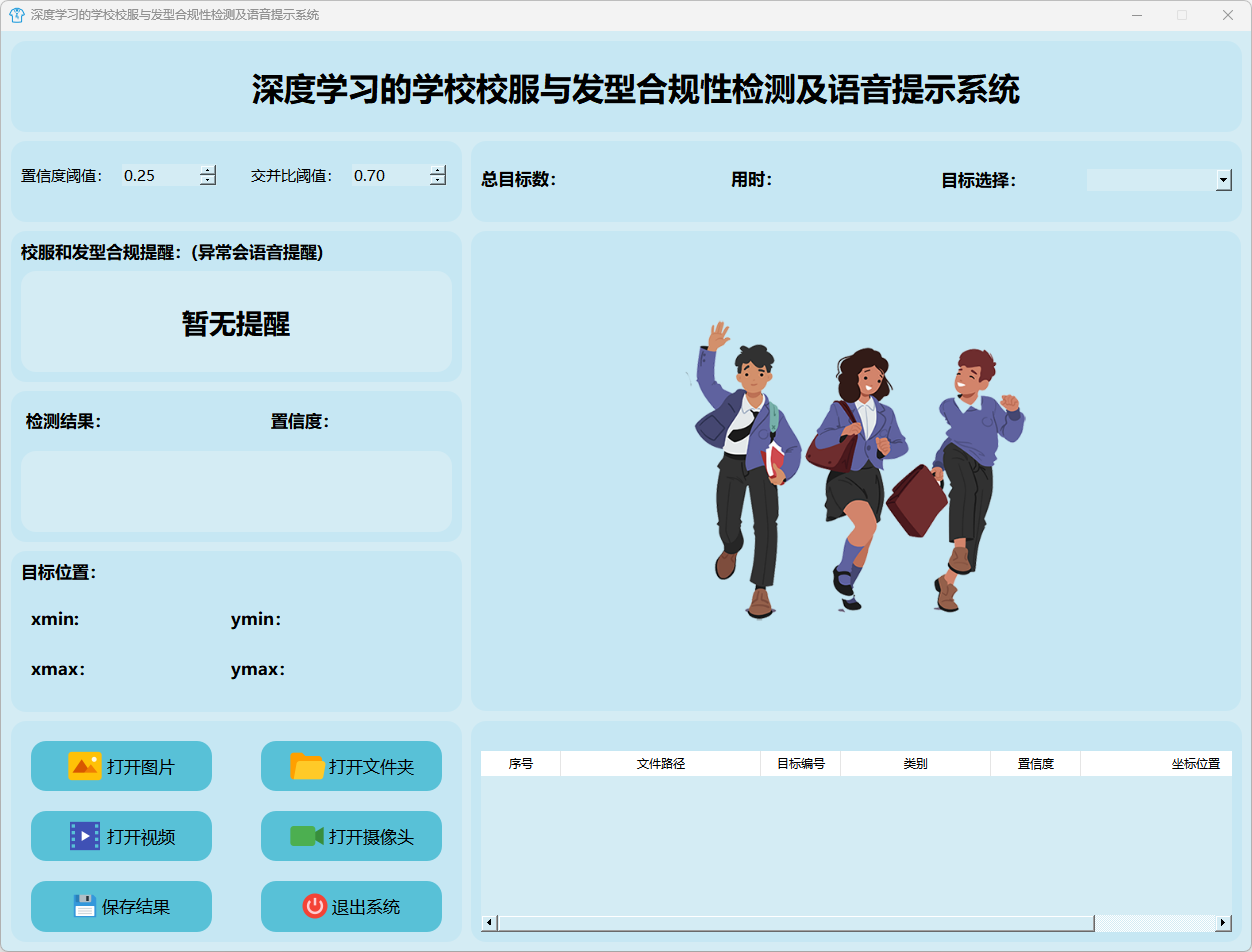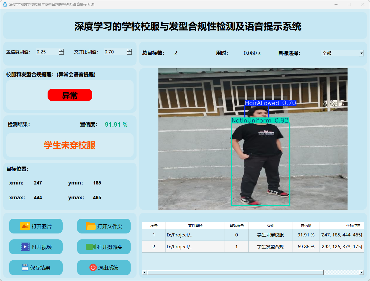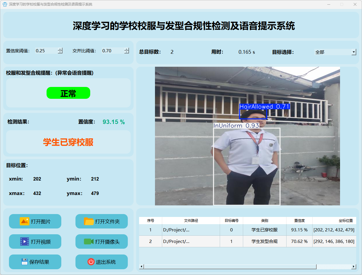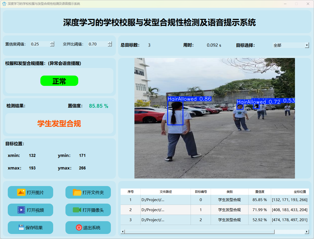 随着校园管理智能化的推进,学生着装与发型合规性成为学校规范管理的重要环节。本文提出了一种基于YOLOv8深度学习模型的学生校服与发型合规性检测及语音提示系统,实现对学生校服穿着情况及发型是否符合规定的自动识别。系统采用PyQt5 构建用户界面,并结合YOLOv8目标检测模型,对实时摄像头图像或上传的图像进行检测。