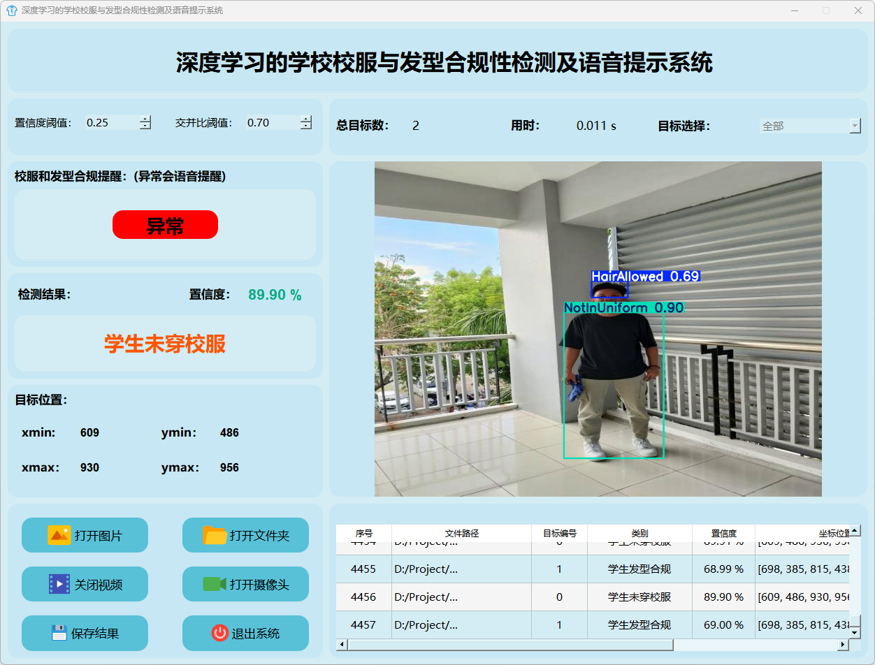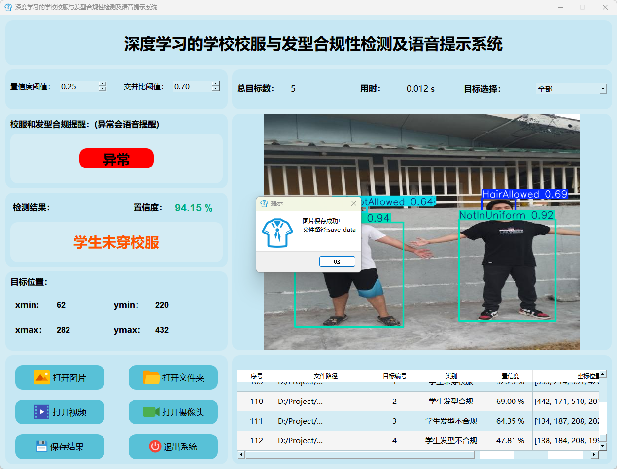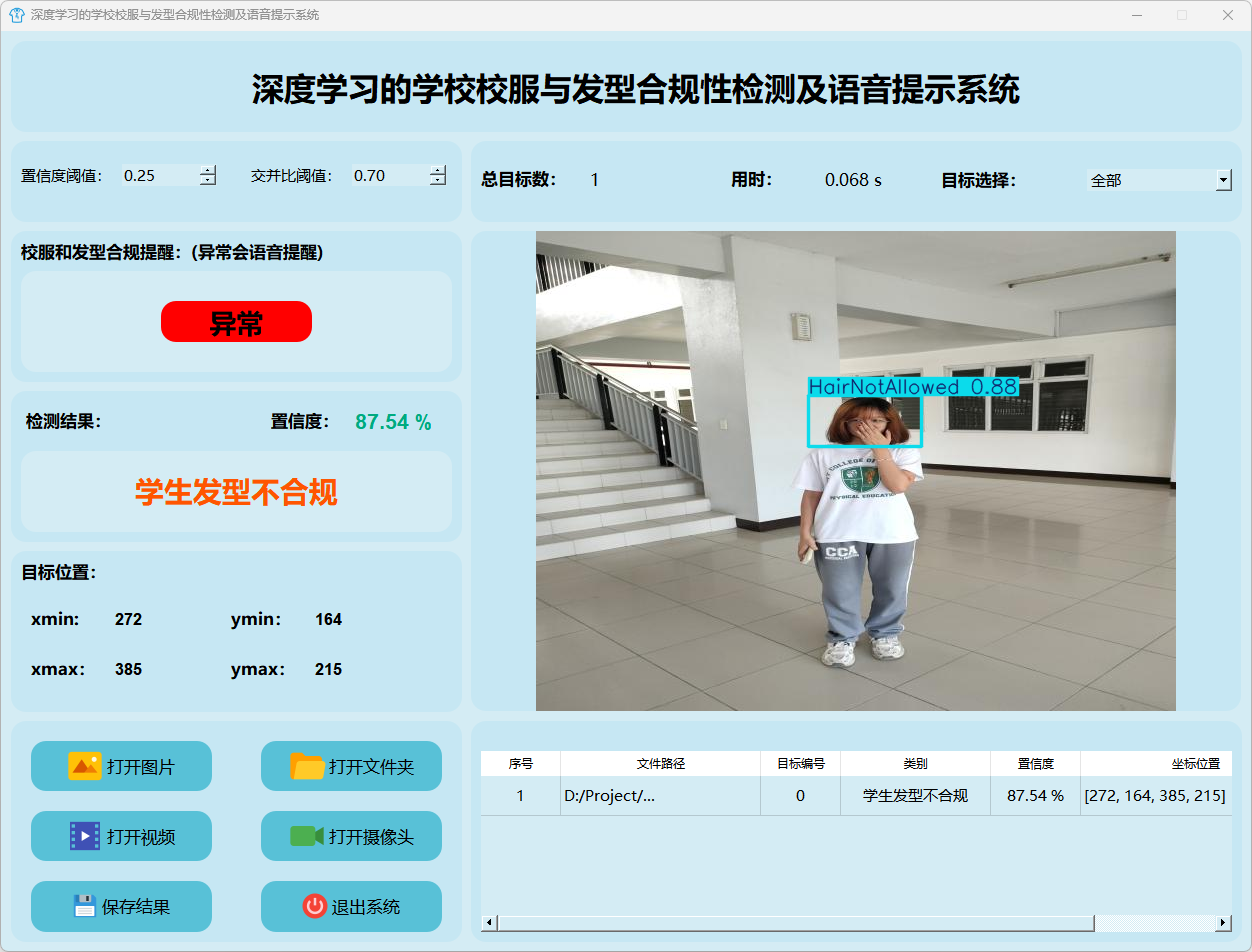 检测结果:系统识别出图片中的校服与发型合规性情况,并显示检测结果,包括总目标数、用时、目标类型、置信度、以及目标的位置坐标信息。