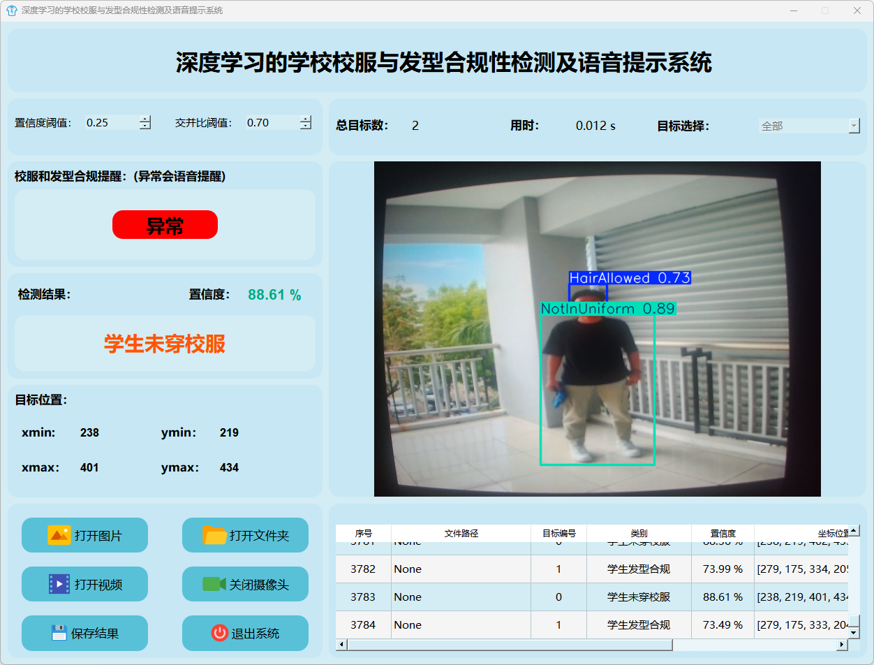 检测结果:系统连接摄像头进行实时分析,检测到校服与发型合规性情况并显示检测结果。实时显示摄像头画面,并将检测到的行为位置标注在图像上,表格下方记录了每一帧中检测结果的详细信息。