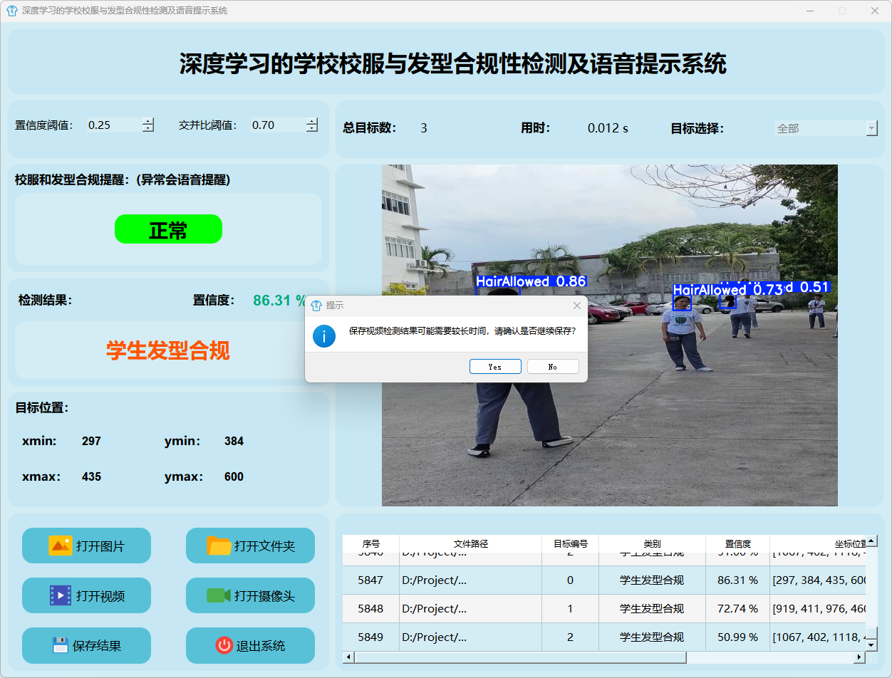 检测结果:系统对视频进行实时分析,检测到校服与发型合规性情况检测结果。表格显示了视频中多个检测结果的置信度和位置信息。