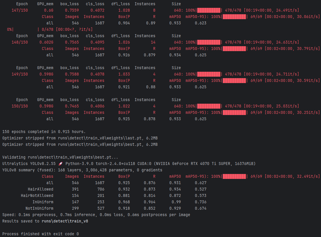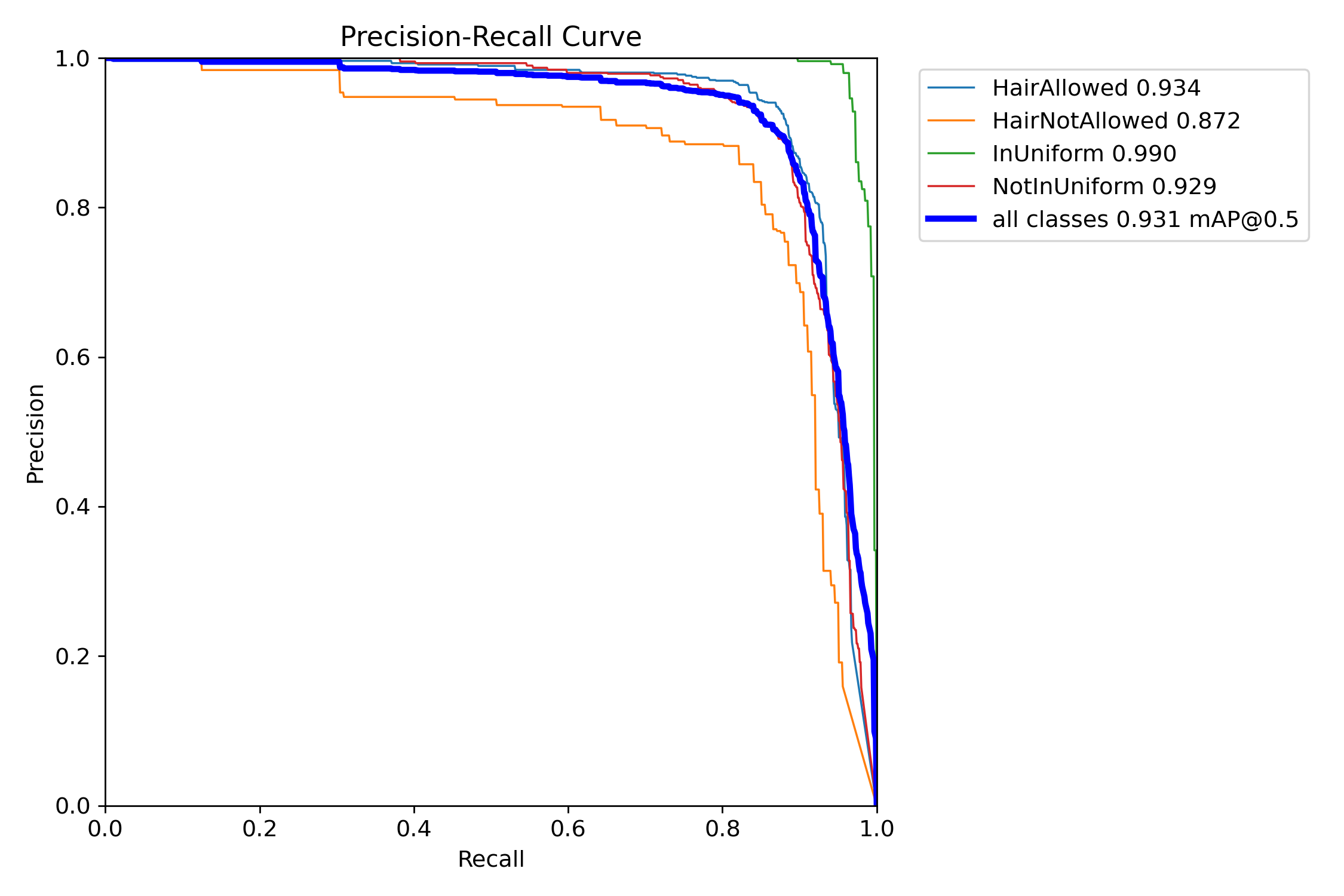 YOLOv8 训练成功,mAP@50 达 93.1%,推理速度快(1.4ms/张),但“发型不合规”识别能力较弱,建议优化数据集和超参数提升泛化能力。