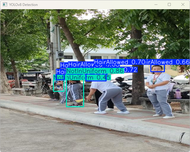 YOLOv8 成功检测到 6 名发型合规者 和 2 名未穿校服者,推理速度快,可通过优化数据和模型提升检测精度与稳定性。