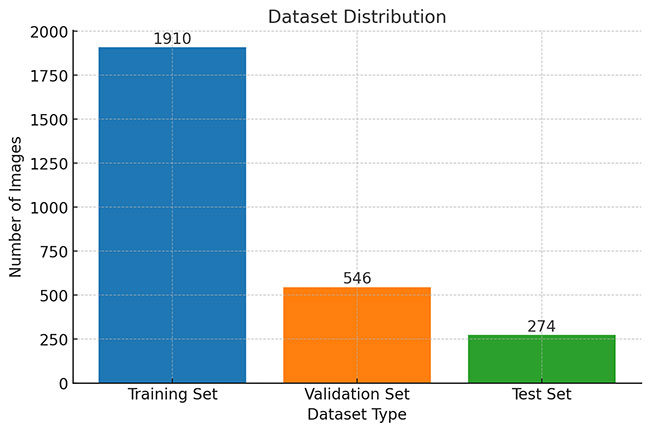 以下柱状图展示了训练集、验证集和测试集的图像数量分布: