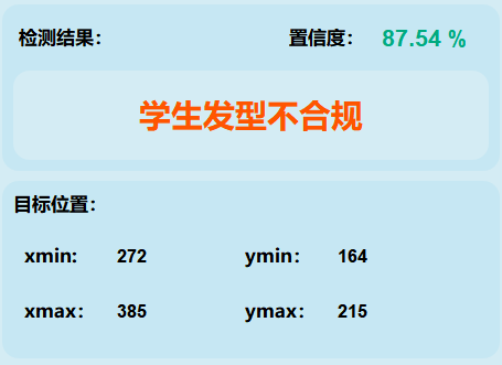 这些坐标表示在图像中的目标区域范围,框定了检测到的“学生发型不合规”的位置。