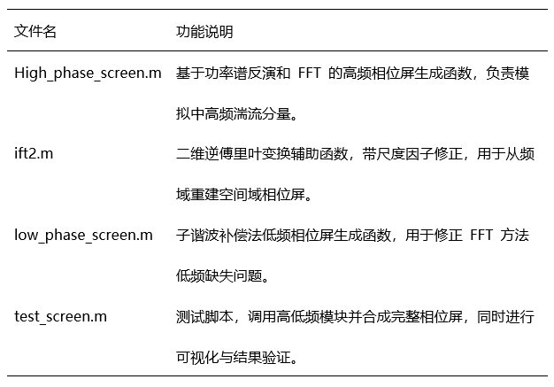 本文在 MATLAB 平台上实现了一套完整的大气湍流相位屏生成工具,融合 FFT 高频建模与子谐波低频补偿,既保证了仿真效率,又提升了相位屏的统计一致性。该工具参数灵活、实现简洁,可直接应用于光学仿真、科研计算与工程系统开发,为相关领域提供了可重复、可扩展的研究平台。