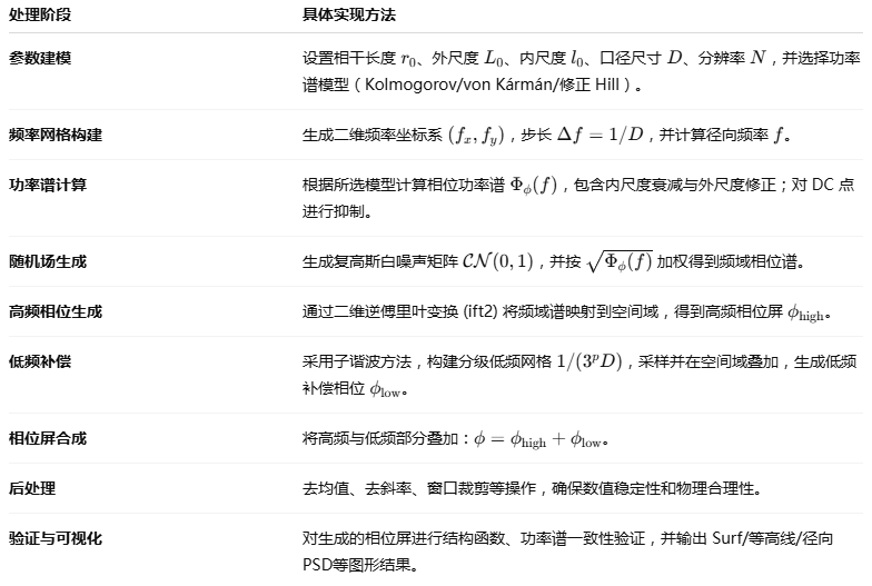 研究方法:本研究采用基于功率谱反演的快速傅里叶变换方法生成高频相位屏,并结合子谐波补偿重建低频分量,从而高效模拟符合大气湍流统计特性的相位屏。