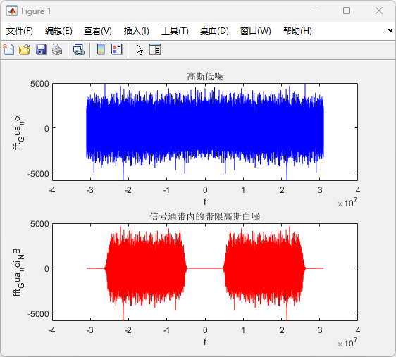 说明:上图是原始高斯白噪声频谱,能量在整个采样带宽内均匀分布;下图是经过带通滤波器限带后的噪声,能量主要集中在 20 MHz 信号通带范围内。