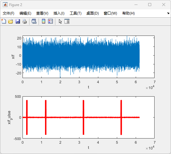 说明:上图为叠加高斯噪声的导航中频信号;下图显示了在 4 个时间点注入的强脉冲干扰。