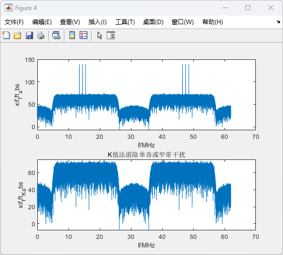 说明:上图为加窗 FFT 后的频谱,窄带干扰表现为突出的离散谱线;下图为 K 值法处理后频谱。