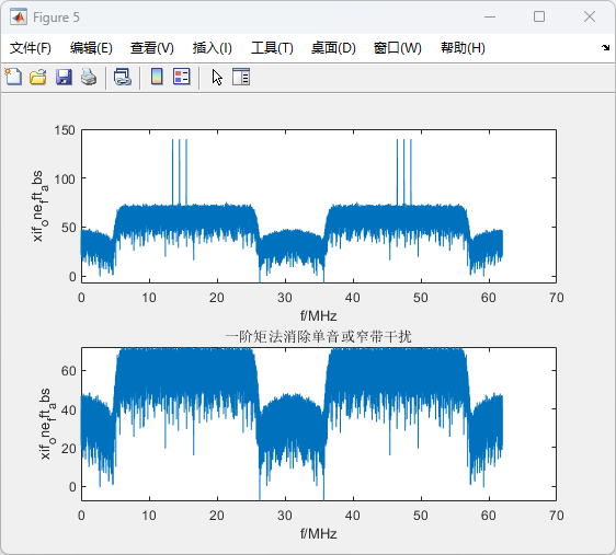 说明:上图为原始频谱,下图为中值门限法处理后的频谱。