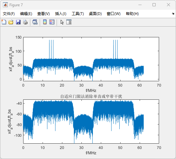 分析:超过门限的干扰频点被置零,谱线消失明显。但固定门限对门限选择敏感,过低会误杀信号,过高则残留干扰。